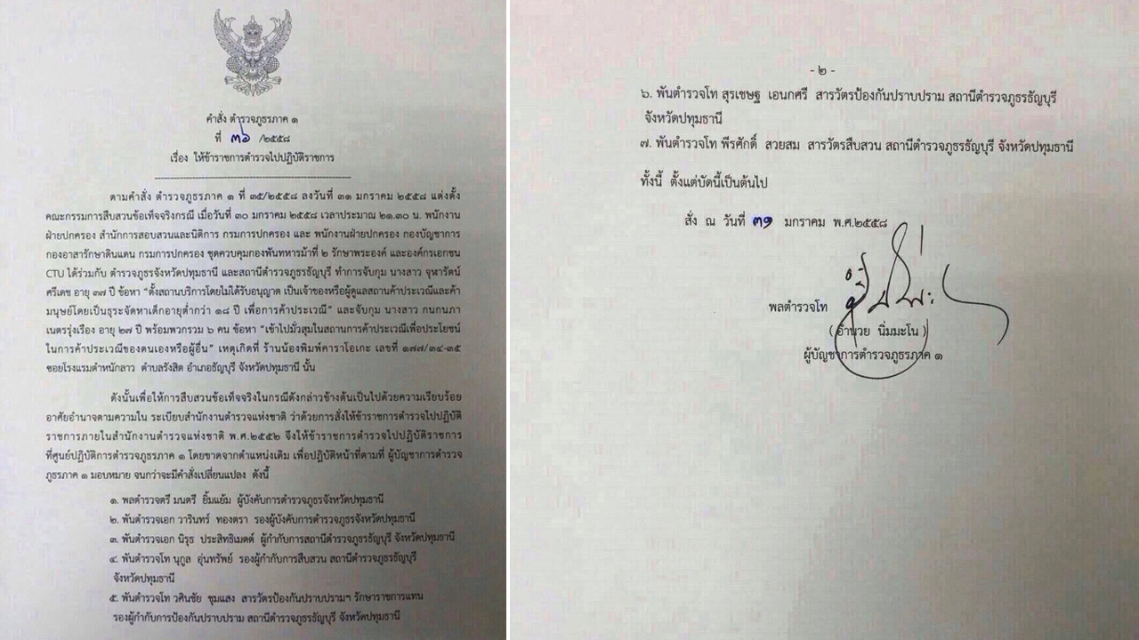 เมื่อวันที่ 31 ม.ค. มีรายงานว่า พล.ต.ท.อำนวย นิ่มมะโน ผบช.ภ.1 ได้เซ็นคำสั่งที่ 36/2558 ให้ข้าราชการตำรวจที่มีรายชื่อต่อไปนี้ไปปฏิบัติราชการที่ศปก.ตร.ภ.1 ประกอบด้วย 1.พล.ต.ต.มนตรี ยิ้มแย้ม ผบก.ภ.จว.ปทุมธานี 2.พ.ต.อ.วารินทร์ ทองตรา รอง ผบก.ปทุมธานี 3. พ.ต.อ.นิรุธ ประสิทธิเมตต์ ผกก.สภ.ธัญบุรี 4.พ.ต.ท.นุกูล อุ่นทรัพย์ รอง ผกก.สส.ฯ 5. พ.ต.ท.วศินชัย ชุมแสง รรท.รองผกก.ป.ฯ 6.พ.ต.ท.สุรเชษฐ เอนกศรี สวป.ฯ และ 7.พ.ต.ท.พีรศักดิ์ สวยสม สว.สส.ฯ โดยให้ขาดจากตำแหน่งเดิมทันทีและปฏิบัติหน้าที่จนกว่าจะมีคำสั่งเปลี่ยนแปลงเพื่อให้การสืบสวนข้อเท็จจริงเป็นไปด้วยความเรียบร้อย