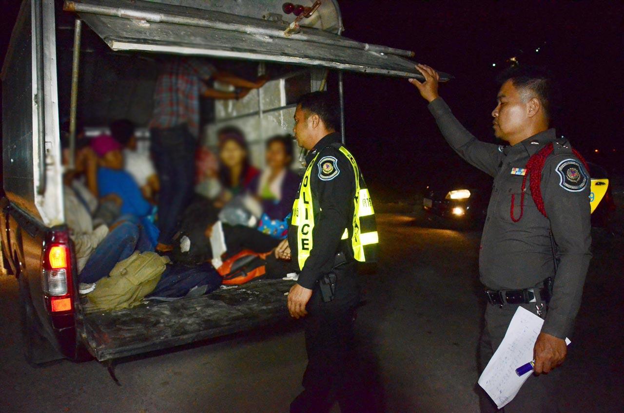 เมื่อเวลา 21.00 น.วันที่ 4 ก.พ.58 พ.ต.ต.สุพัฒน์ โชติไกรสิทธิ์ สว.สทล.4 กก.2 ชุมพร สืบทราบว่าจะมีแก๊งค้าแรงงานเถื่อนต่างด้าวลักลอบผ่านเข้ามาในพื้นที่รับผิดชอบ จึงสั่งการให้ ร.ต.อ.ภานุวัฒน์ โฉมยงค์ ร.ต.ท.สาวิทย์ ขุนแผน รอง สว.สทล.4 กก.2 ชุมพร นำกำลังพร้อมรถตรวจการณ์ ออกตรวจสกัด จนกระทั่งพบรถยนต์กระบะอีซูซุ รุ่นดีแมก ตอนเดียว สีเลือดหมู ทะเบียน ผค 2955 สุราษฎร์ธานี กระบะหลังทำหลังคาปิดมิดชิด เป็นรถตามที่ได้รับแจ้ง ขับมาบนถนนเพชรเกษมช่องทางขาล่องใต้ ช่วงหลัก กม.483-484 ต.วังไผ่ อ.เมือง จ.ชุมพร จึงเข้าสกัดให้หยุดเพื่อตรวจสอบ ทราบคนขับชื่อ นายชัยยุทธ หรือเก่ง เชิดรัมย์ อายุ 34 ปี อยู่บ้านเลขที่ 329 /6 หมู่ 5 ต.บางริ้น อ.เมือง จ.ระนอง ตรวจสอบในกระบะหลังพบแรงงานต่างด้าวชาวพม่า 30 คน แยกเป็นชาย 22 คน หญิง 8 คน ตรวจสอบไม่มีหลักฐานการขออนุญาตเข้าเมือง จึงควบคุมตัวคนขับรถและแรงงานต่างด้าวทั้งหมดไปสอบสวนขยายพลที่สถานีตำรวจทางหลวงชุมพร