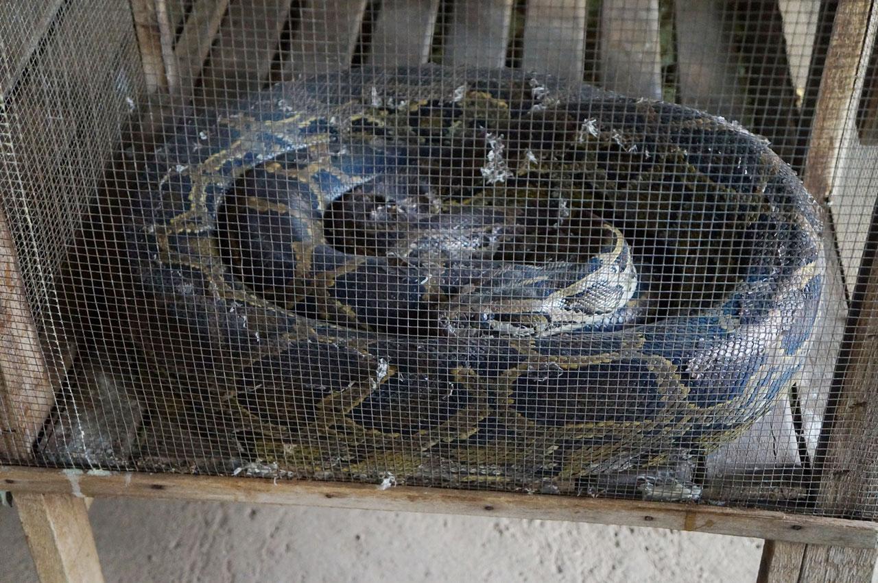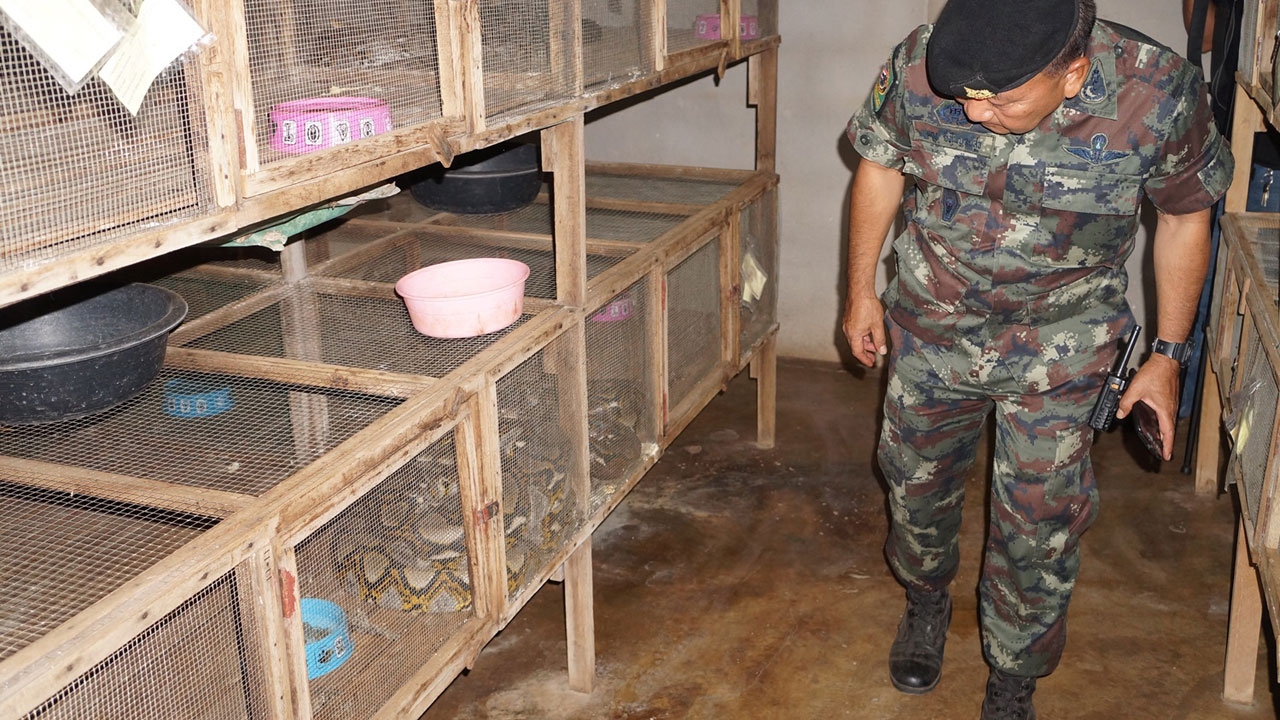 เมื่อเวลา 12.00 น. วันที่ 5 ก.พ. 58 พล.ต.ผดุง ยิ่งไพบูลย์สุข ผบ.จทบ.พิษณุโลก ในฐานะ ผอ.กอ.รส.จ.สุโขทัย ร่วมกับสำนักบริหารพื้นที่อนุรักษ์ที่ 14 (ตาก) โดย นายพลวีร์ บูชาเกียรติ หน.เขตรักษาพันธุ์สัตว์ป่าถ้ำเจ้าราม จ.สุโขทัย เจ้าหน้าที่ฝ่ายปกครอง และเจ้าหน้าที่ตำรวจ สภ.ศรีสัชนาลัย เข้าตรวจสอบที่ บริษัท ศรีสัชนาลัย ไพธัน ฟาร์ม จำกัด ซึ่งเป็นฟาร์มเพาะเลี้ยงงูเหลือมและงูหลามขนาดใหญ่ เพื่อชำแหละหนังงูฟอก ส่งออกต่างประเทศ บนเนื้อที่กว่า 100 ไร่ กลางไร่อ้อย ตั้งอยู่เลขที่ 33 ม.2 ถ.ศรีสัชนาลัย-อุตรดิตถ์ ต.ดงคู่ อ.ศรีสัชนาลัย ไม่มีชุมชนอาศัยรอบข้าง