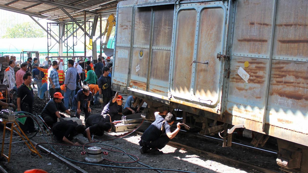 เจ้าหน้าที่ซ่อมบำรุงและเจ้าหน้าที่ฝ่ายการโยธา การรถไฟแห่งประเทศไทย กำลังเร่งกู้โบกี้รถไฟสำหรับเก็บของที่ตกรางบริเวณชานชาลาที่ 12 สถานีรถไฟหัวลำโพง ทำให้คานหลังคาชานชาลา ที่กั้นทางรถไฟและป้ายที่กั้นเสียหาย เบื้องต้นไม่พบผู้บาดเจ็บและเสียชีวิต ด้านผู้ว่าการ รฟท.เตรียมยกเครื่องการทำงานใหม่หมดภายใน 3-6 เดือน.