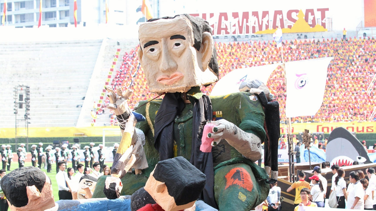 หุ่นทหารชุดเขียวเนื้อตัวเต็มไปด้วยสติกเกอร์ มือถือแปรงซักผ้า กำลังขัดล้างหุ่นสวมเสื้อเหลือง-แดง-ฟ้า ในกะละมัง สื่อถึงทหารที่ทำความสะอาดพวกที่ไม่ทำความสะอาดตัวเอง หนึ่งขบวนพาเหรดฟุตบอลประเพณีจุฬาฯ-ธรรมศาสตร์.