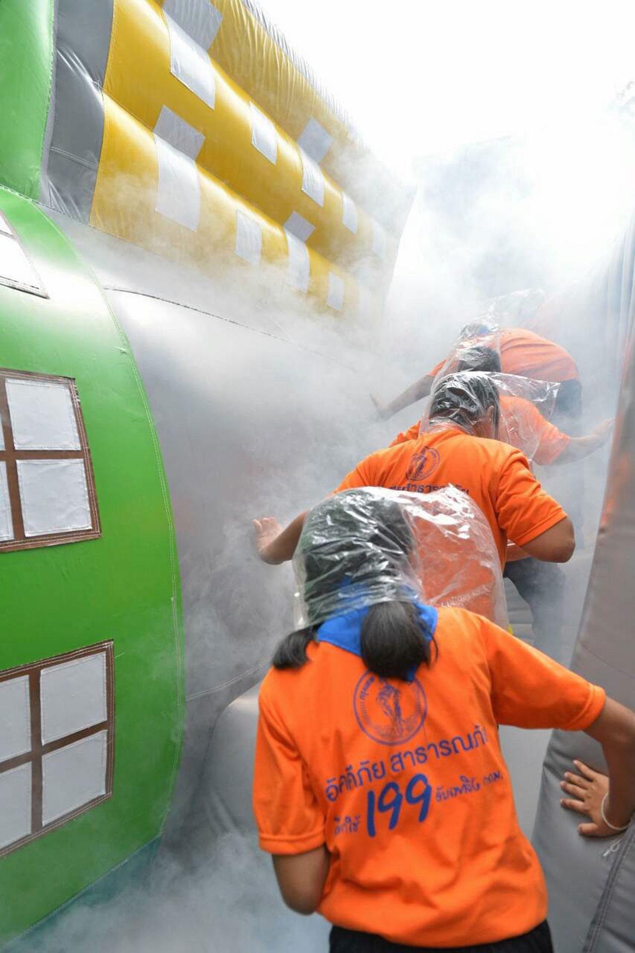 สำหรับกิจกรรมที่จัดขึ้นจะจำลองสถานการณ์ต่างๆให้เด็กๆร่วมสนุกเพื่อเรียนรู้ แบ่งออกเป็น 5 ฐาน ได้แก่ อัคคีภัย อุทกภัย/วาตภัย แผ่นดินไหว ภัยจากสารเคมีวัตถุอันตราย และการปฐมพยาบาลเบื้องต้น โดยเน้นให้เด็กได้ทดลองปฏิบัติในสถานการณ์จริง เช่น ฐานอัคคีภัยจะสอนให้รู้จักประเภทของไฟและลักษณะเพลิงไหม้ต่างๆ โดยใช้วีดิโออธิบายเด็กๆ เช่น เพลิงไหม้จากน้ำมัน หรืออุปกรณ์ไฟฟ้า หรือแก๊สหุงต้ม เพื่อป้องกันการเกิดเพลิงไหม้ รู้จักวิธีการช่วยเหลือตนเองเมื่อเกิดเหตุเพลิงไหม้ เช่น ใช้ผ้าชุบน้ำปิดจมูก การหลบหนีจากพื้นที่เพลิงไหม้ ให้ความรู้แก่เด็กในการอพยพและช่วยเหลือตัวเอง