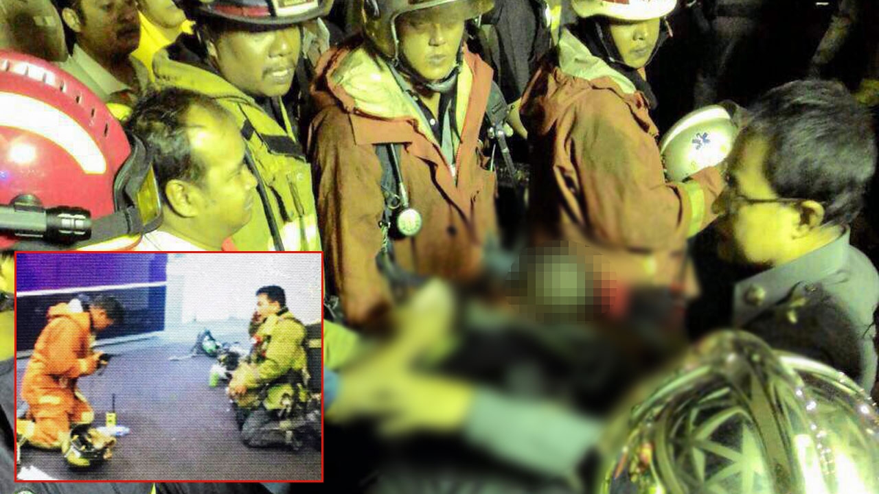 เจ้าหน้าที่บรรเทาสาธารณภัยนำศพนายเดชา ด้วงชนะ อายุ 35 ปี อปพร.หลักสี่ ออกจากซากเพลิงไหม้อาคารเอสซีบีสำนักงานใหญ่ (ภาพเล็ก) วงจรปิดบันทึกนาทีนายเดชา (คนขวา) ก่อนเข้าดับเพลิงจนตัวเองสำลักควันขาดอากาศหายใจตาย.