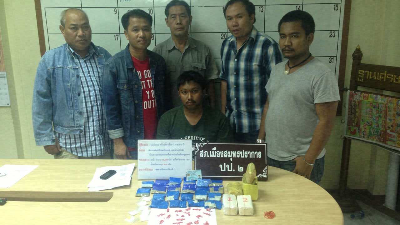 เมื่อเวลา 01.30 น. วันที่ 9 ก.พ. 58 พ.ต.ท.ธนกฤษ รวยอารี สวป.สภ.เมืองสมุทรปราการ พร้อมด้วยกำลังเจ้าหน้าที่ชุดปราบปรามยาเสพติด สภ.เมืองสมุทรปราการ ขยายผลจับกุมนายโสภณ หรือปลั๊ก ปั้นสง่า อายุ 23 ปี พร้อมด้วยของกลางยาบ้าจำนวน 10,200 เม็ด และยาไอซ์อีก 36.8 กรัม มูลค่ากว่า 4 ล้านบาท