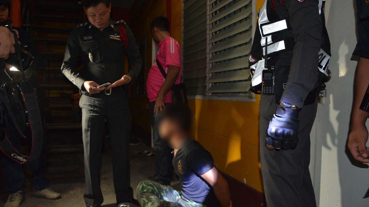 ที่เกิดเหตุพบพลเมืองดีกำลังช่วยกันควบคุมตัว ผู้ก่อเหตุไว้ได้ ทราบชื่อคือ พลทหารเอก (นามสมมติ) อายุ 23 ปี สังกัดค่ายทหารแห่งหนึ่ง อยู่ในสภาพสะบักสะบอม ใบหน้าปูดบวม พร้อมของกลางอาวุธมีดปังตอ 1 เล่ม และสร้อยคอทองคำหนัก 1 สลึง โดยมี น.ส.จิ๋ว (นามสมมติ) อายุ 20 ปี เป็นผู้เสียหาย ยืนรอให้การกับเจ้าหน้าที่