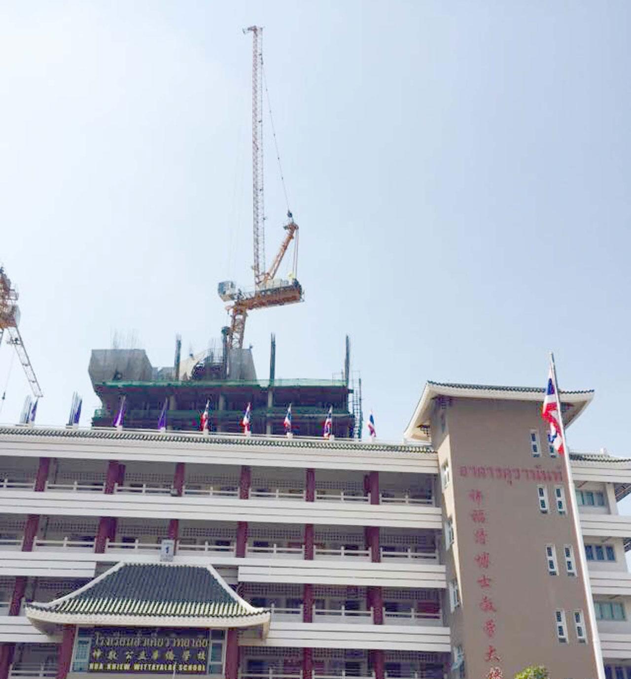 นายนภ เปิดเผยอีกว่า อาคารชุดดังกล่าวชื่อ The Houze มีการก่อสร้างมาตั้งแต่เดือนมิถุนายน 2557 เป็นคอนโดฯ 37 ชั้น กระทบกับทางโรงเรียนทั้งเรื่องเสียง ฝุ่น และอาคาร 5 ชั้นก็ร้าว เคยทำเรื่องถึงเจ้าของโครงการ ก็ได้รับการยืนยันว่า โครงการได้รับอนุญาตให้มีการก่อสร้างถูกต้อง ตามเทศบัญญัติและโครงการก็ปฏิบัติตามระเบียบการก่อสร้างอาคารสูง ผลกระทบไม่มี ล่าสุดคือเครนที่ใช้ก่อสร้างมีปัญหา จนต้องสั่งปิดโรงเรียนอย่างที่เห็น เพราะโรงเรียนฮั่วเคี้ยวเป็นโรงเรียนที่มีนักเรียนตั้งแต่อนุบาลถึง ม.6 รวม 1,400 คน ครู 100 คน จำเป็นต้องปิดเรียน เพื่อความปลอดภัยของทุกคน