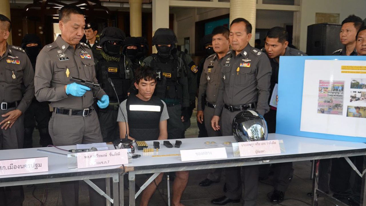 พร้อมของกลางปืนกล็อก .45 จำนวน 1 กระบอก กระสุน 52 นัด ปลอกกระสุน 1 ปลอก สร้อยคอทองคำ หนัก 1 บาท พระเลี่ยมทอง 1 องค์ รถ จยย.ฮอนด้า เวฟ ไอ สีน้ำเงินขาว หมายเลขทะเบียน กมค 35 นครปฐม ที่ใช้ก่อเหตุ ตั้งข้อกล่าวหาชิงทรัพย์เป็นเหตุให้ผู้อื่นถึงแก่ความตาย โดยมีและใช้อาวุธปืนหรือโดยใช้ยานพาหนะเพื่อกระทำผิดหรือการพาทรัพย์นั้นไป หรือเพื่อให้พ้นการจับกุม, ฆ่าผู้อื่นเพื่อจะเอาซึ่งผลประโยชน์อันเกิดแต่การที่ตนได้กระทำความผิดอื่น, มีอาวุธปืนและเครื่องกระสุนปืนไว้ในความครอบ– ครองโดยไม่ได้รับอนุญาต พกพาอาวุธปืนติดตัวไปในเมืองหมู่บ้านหรือทางสาธารณะโดยไม่มีเหตุอันควรจำเป็นเร่งด่วนและโดยไม่ได้รับอนุญาต