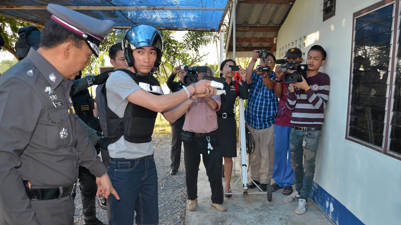 นายเจษฎา รำพึงจิต ผู้ต้องหาประวัติร้าย ถูกตำรวจคุมตัวไปทำแผนจ่อยิง ด.ต.มานะ สุขไกร สายตรวจ สภ.เมืองนครปฐม ดับสยอง พร้อมชาวบ้าน 2 ศพ คาป้อมยามสะแกลาย ก่อนชิงสร้อยคอทองคำหนัก 2 บาทเผ่นหนี.
