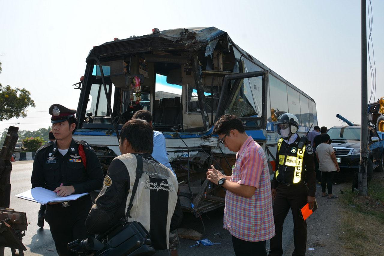 ที่เกิดเหตุ พบรถบัสปรับอากาศสายกรุงเทพฯ - ชัยนาท ทะเบียน 10- 0827 ชัยนาท สภาพด้านหน้าพังยับเยิน ห่างออกไปยังพบรถบรรทุกสิบล้อ ยี่ห้ออีซูซู ทะเบียน 84-6063 ชลบุรี บรรทุกรถแทรกเตอร์ ตกลงไปข้างทาง และยังพบรถยนต์ที่ถูกชนอีก 2 คัน ได้รับความเสียหาย