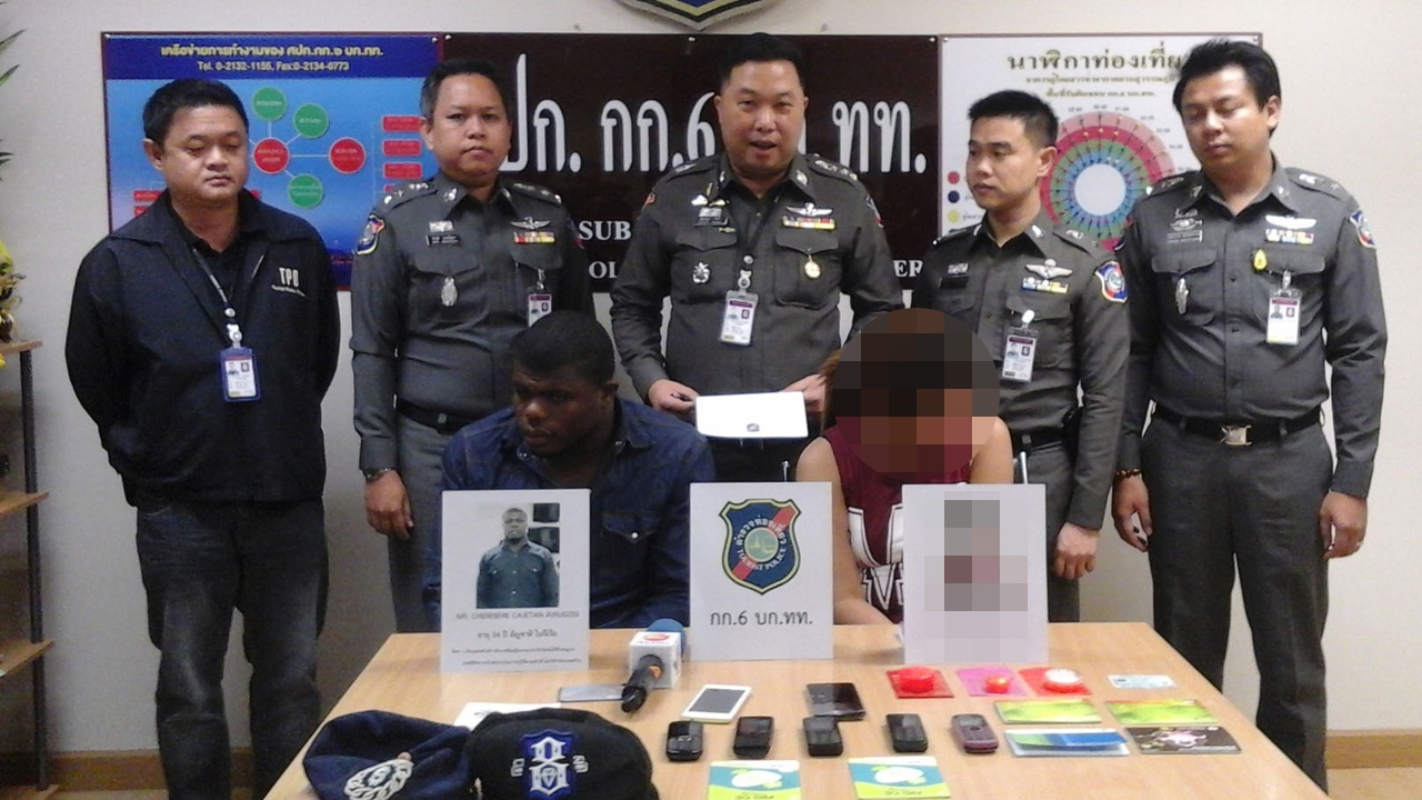 เมื่อเวลา 22.00 น.วันที่ 10 ก.พ.58 ที่กองบังคับการ 6 ตำรวจท่องเที่ยว ท่าอากาศยานสุวรรณภูมิ พ.ต.อ.ศุภเศรษฐ์ โชคชัย รองผบก.ทท. พ.ต.อ.ศารุติ แขวงโสภา ผกก.6 บก.ทท. พ.ต.ท.สุรชัช สุวรรณศรี รอง ผกก.6 พ.ต.ท.ชวินโรจน์ ภีมรัชตธํารงค์ สว.กก.6 พ.ต.ต.ก่อเกียรติ วุฒิจํานงค์ สว.กก.6 และเจ้าหน้าที่ตำรวจ กก.6 บก.ทท.ร่วมกันแถลงผลจับกุม ผู้ต้องหาเครือข่ายแก๊งหลอกหญิงไทยโอนเงินผ่านอินเทอร์เน็ต ประกอบด้วย น.ส.สุภาพร เอี่ยมวิจิตร อายุ 30 ปี ชาวบ้านหมู่ที่ 7 ต.คลองสวนพลู อ.พระนครศรีอยุธยา จ.พระนครศรีอยุธยา และนายชิดิเอเบเร คาเจทาน อวูโกซี อายุ 35 ปี สัญชาติไนจีเรีย พร้อมของกลางโทรศัพท์มือถือ 7 เครื่อง สมุดบัญชีธนาคารต่างๆ 4 เล่ม และซิมโทรศัพท์มือถือ อีกจำนวนหนึ่ง