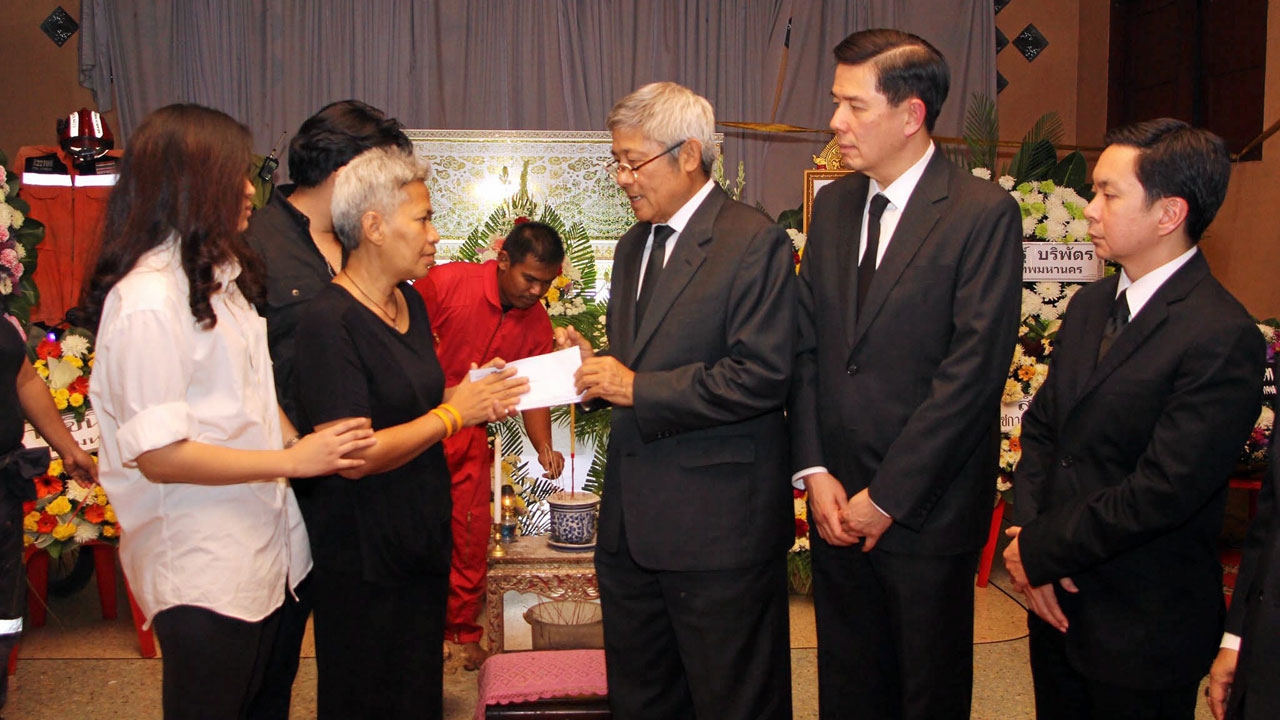 ต่อมาเมื่อเวลา 17.30 น. นางจุติมา จะโนภาษ อายุ 54 ปี มารดา ครอบครัวและเพื่อนอาสาฯ ของนายเดชา ด้วงชนะ หรือตั้ม หลักสี่ อายุ 35 ปี เจ้าหน้าที่และครูฝึกอาสาสมัครป้องกันและบรรเทาสาธารณภัยฝ่ายพลเรือน (อปพร.) เขตหลักสี่ รหัส 44-33 ที่เสียชีวิตลงจากการปฏิบัติหน้าที่ขณะเข้าไปดับเพลิงภายในธนาคารไทยพาณิชย์ฯ สำนักงานใหญ่ เมื่อดึกคืนวันที่ 8 ก.พ. ได้นิมนต์พระสงฆ์ 1 รูป จากวัดดอนเมืองมาทำพิธีเชิญดวงวิญญาณนายเดชาบริเวณชั้น 10 ของอาคาร ริมหน้าต่างติดกับกระจกประตูทางเดิน ซึ่งเป็นจุดที่นายเดชาเสียชีวิต บรรยากาศระหว่างทำพิธีเป็นไปด้วยความโศกเศร้าจนกระทั่งประกอบพิธีเสร็จสิ้น