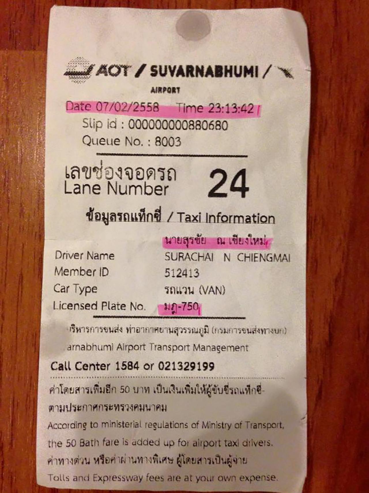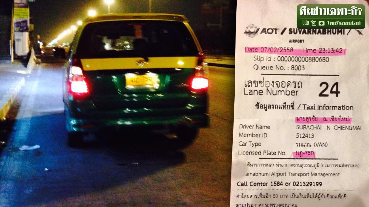 ทางทีมข่าวเฉพาะกิจไทยรัฐออนไลน์ จึงได้ติดต่อไปยัง คุณติ๊ก ผู้ที่ประสบเหตุการณ์ดังกล่าว ถ่ายทอดให้ฟังว่า เมื่อวันเสาร์ที่ 7 กุมภาพันธ์ 2558 ที่ผ่านมา ช่วงเวลาประมาณเที่ยงคืน ตนเองและเพื่อนอีก 1 คน ได้ใช้บริการรถแท็กซี่ที่สนามบินสุวรรณภูมิ ที่ชั้น 1 โดยมีเจ้าหน้าที่กดบัตรคิวให้ เป็นรถแท็กซี่ ประเภทแวน โดยจุดหมายปลายทางมี 2 จุด คือ หมู่บ้านที่ซอยวัดพระเงิน และหมู่บ้านที่ซอยวัดส้มเกลี้ยง อ.บางใหญ่ จ.นนทบุรี ตามใบบัตรคิวจะระบุชื่อผู้ขับขี่รถแท็กซี่คือ นายสุรชัย ณ เชียงใหม่ รถโตโยต้าสีเขียว-เหลือง เลขทะเบียน มฎ 750 กรุงเทพมหานคร ซึ่งตามปกติ ก็จะใช้บริการรถแท็กซี่จากสนามบินสุวรรณภูมิ กลับบ้านเป็นประจำทุกเดือน เพราะมีเดินทางไปต่างประเทศอยู่บ่อยๆ โดยเฉลี่ยค่ามิเตอร์อยู่ที่ประมาณ 400 บาท และเมื่อ 1-2 เดือนที่ผ่านมา มีการปรับขึ้นราคามิเตอร์แท็กซี่ ก็เคยใช้บริการรถแท็กซี่จากสนามบินสุวรรณภูมิเช่นกัน โดยเฉลี่ยค่ามิเตอร์ประมาณ 450 บาท