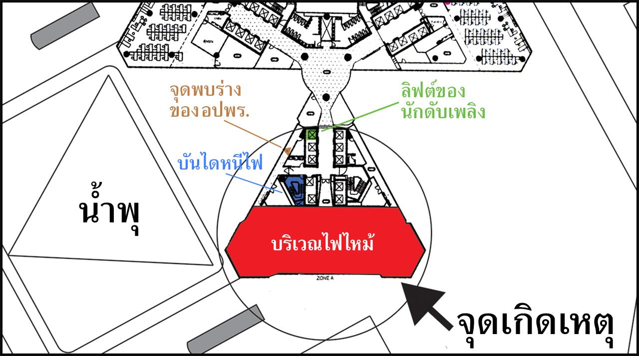 นายจักรกฤษณ์ หรือ เอ็กซ์ นักผจญเพลิง หัวหน้าชุดปฏิบัติงานที่เข้าพื้นที่ตึก เล่าให้ทีมข่าวเฉพาะกิจไทยรัฐออนไลน์ฟังว่า หลังจากรับแจ้ง เวลา 22.12 น. ตนและทีมงานได้เดินทางจาก สถานีดับเพลิงสุทธิสารไปถึงที่เกิดเหตุภายในเวลา 9 นาที เมื่อไปถึงพบเห็นแสงเพลิงที่ตัวตึก ซึ่งแลบออกมาจากตัวตึกและเห็นกระจกแตกแล้ว ดังนั้น จึงคาดว่า ไฟน่าจะไหม้มาแล้วไม่ต่ำกว่าครึ่งชั่วโมง เพราะอุณหภูมิภายในน่าจะสูงมาก ทำให้กระจกของตึกแตก เมื่อเห็นดังนั้น จึงได้ร้องขอแบบแปลนกับเจ้าหน้าที่ตึก แต่ก็ไม่ได้ จึงตัดสินใจขึ้นตัวตึก โดยขึ้นทางบันไดหนีไฟ โดยมีทีมของ นายเดชา ด้วงชนะ อายุ 31 ปี (อปพร. ที่เสียชีวิต บริเวณชั้น 10) ขึ้นมาอีกชุดหนึ่ง โดยทีมตนกับ ทีมนายเดชา ขึ้นกันคนละทาง และได้มาเจอกันที่บริเวณชั้น 9 จากนั้นก็ได้ช่วยกันหาต้นเพลิงแต่ก็ไม่พบ เนื่องจากมีกลุ่มควันหนาแน่นมาก เพราะควันถูกกดให้ต่ำจากน้ำที่สปริงเกอร์ที่ทำงาน