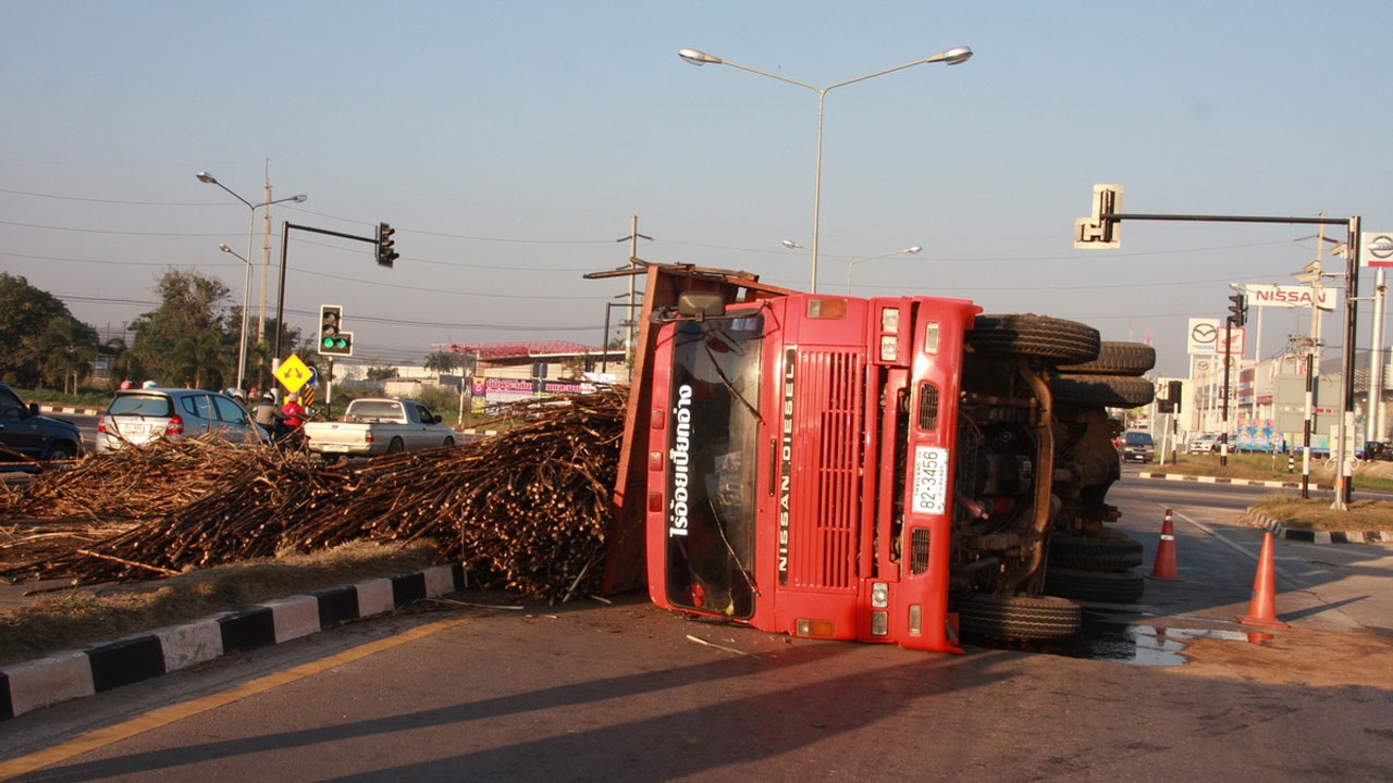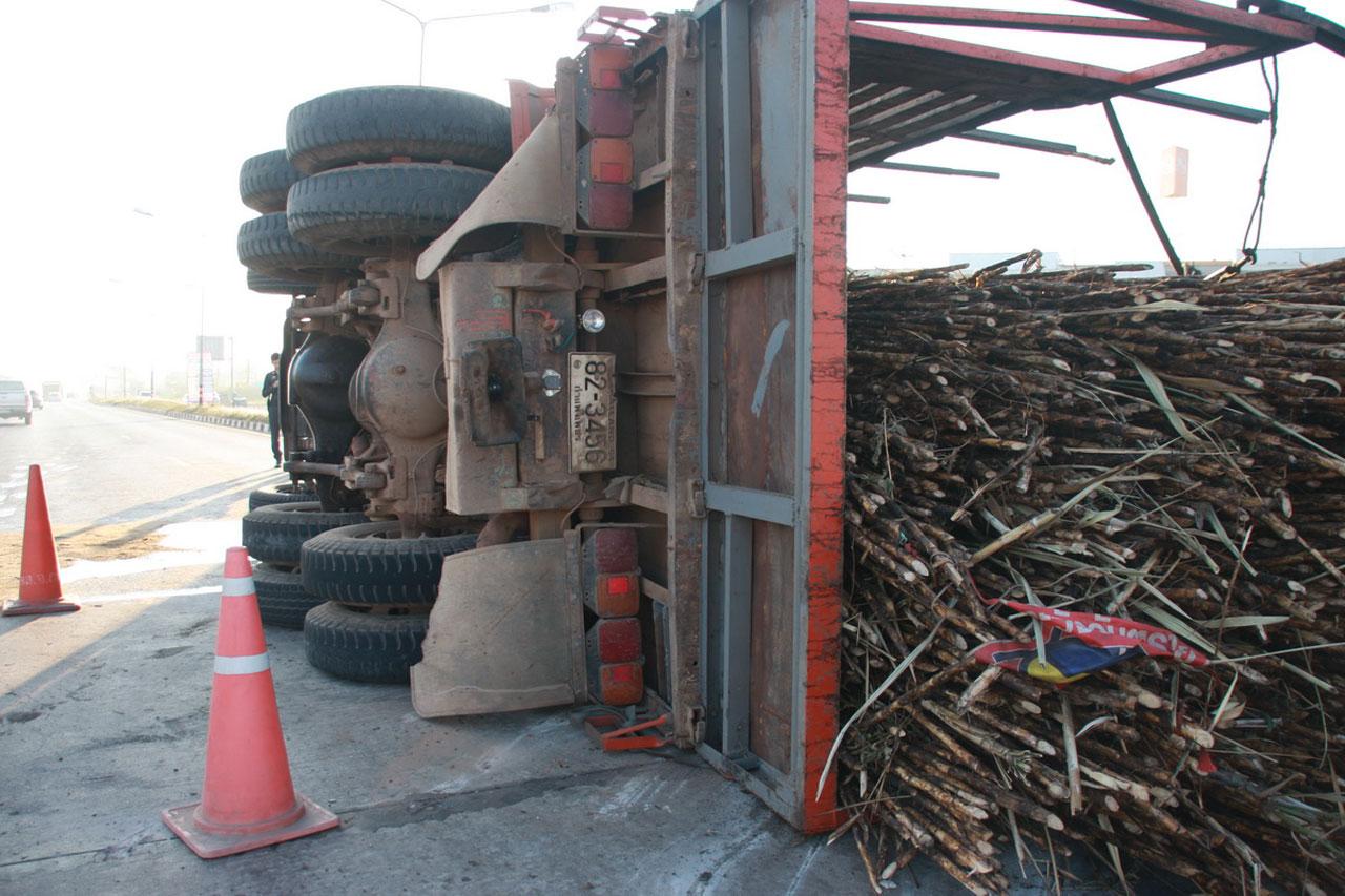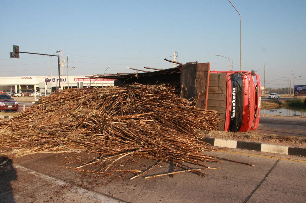รถสิบล้อบรรทุกอ้อยเต็มคัน ก่อนถึง 4 แยกไฟแดงเบรกไม่อยู่ ตัดสินใจหักเลี้ยวไม่ให้ชนรถที่ติดไฟแดง แต่อ้อยที่บรรทุกมาสูงและหนัก ทำให้รถทั้งคันพลิกตะแคงนอนราบกับพื้น เทกระจาด อ้อยกระจายเต็มถนน ปิดการจราจรไป 2 เลน