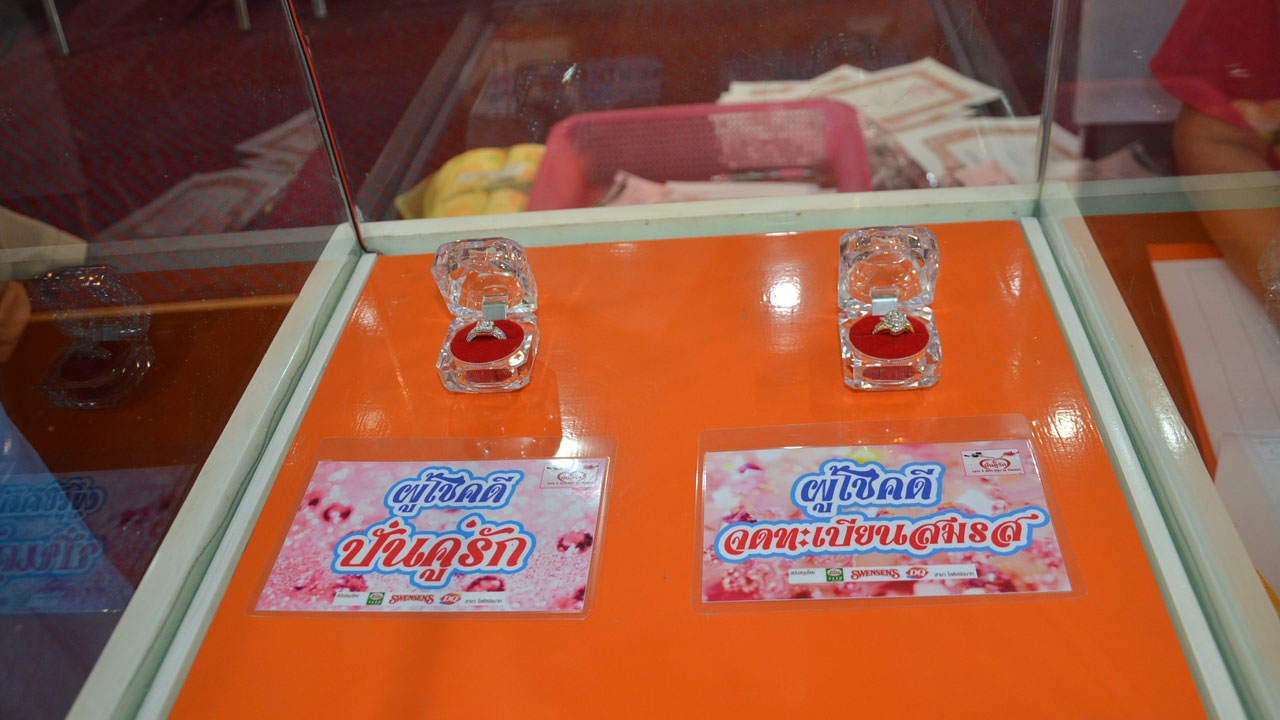 คู่สมรสแห่จดทะเบียนกับอำเภอเมืองชัยนาทกว่า 50 คู่ พร้อมรอลุ้นแหวนเพชรมูลค่า 100,000 บาทฟรี พบว่าคู่รักที่มาเป็นคู่แรก ออกจากบ้านที่เมืองลพบุรี ตั้งแต่ 04.30 น.