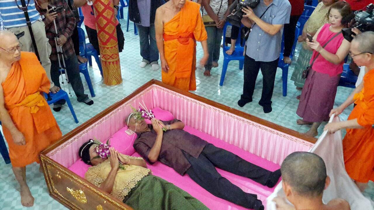 น.ส.พิชายา แท่นพิมพ์ และ น.ส.ภัทรณยา คำพลอย คู่บ่าวสาวทอมดี้ กล่าวว่า รู้สึกดีใจมากที่ได้มาจัดพิธีแต่งงานกันขึ้นที่วัดในครั้งนี้ โดยตนได้คบหากันมานานกว่า 3 ปี ก่อนหน้านี้ก็คิดที่จะแต่งงานกันมาตลอด แต่ติดตรงที่ว่าสังคมเรายังไม่ค่อยยอมรับในเรื่องหญิงรักหญิง หรือชายรักชายเท่าไร กระทั่งมาทราบข่าวว่าทางวัดได้จัดให้มีการแต่งงานวิวาห์ลงโลงขึ้น จึงได้ติดต่อกับทางวัดว่า ตนเป็นคู่ทอมดี้ สามารถร่วมแต่งงานได้หรือไม่ ทางวัดก็อนุญาต ตนทั้งสองคนจึงเดินทางมาร่วมพิธีวิวาห์