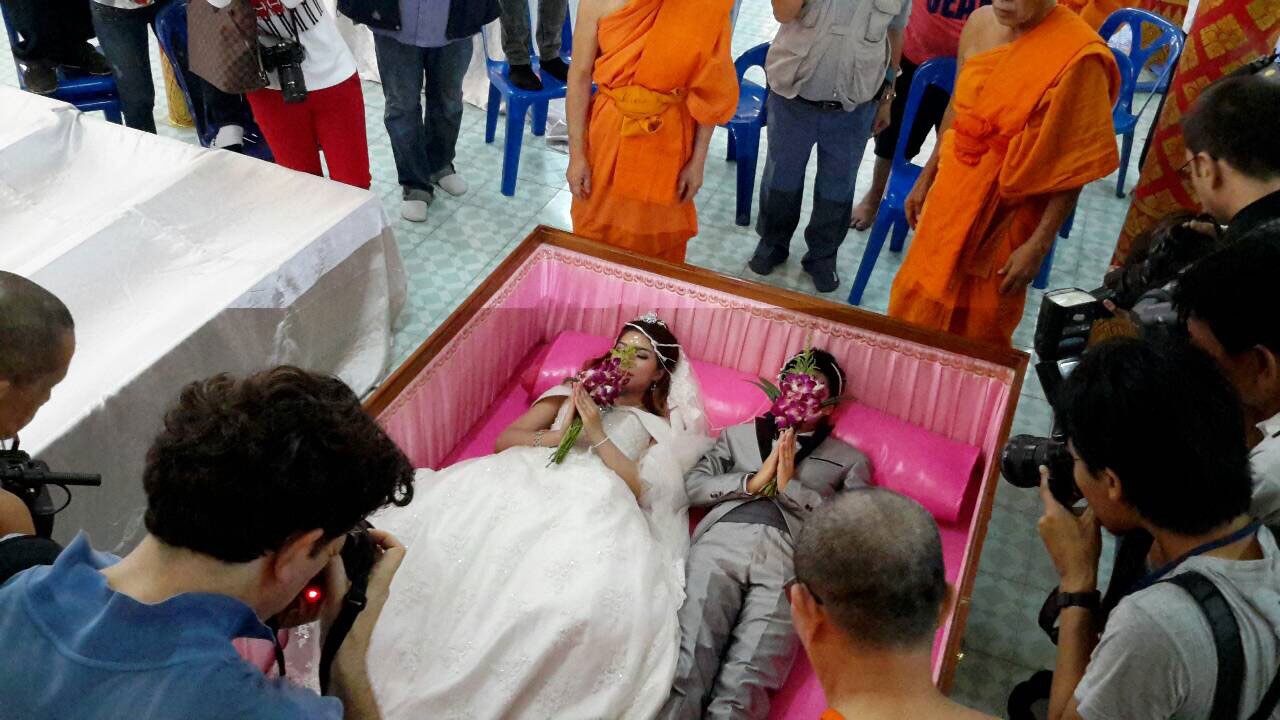 เมื่อขบวนบ่าวสาวทั้งหมดมาถึง ได้นำเครื่องสังฆทานที่เตรียมมานำไปถวายแด่พระภิกษุสงฆ์จนครบทุกคู่แล้ว พระครูสมุห์สงบ กิตติญาโญ เจ้าอาวาสวัดตะเคียน ได้เริ่มทำพิธีวิวาห์ ให้คู่บ่าวสาวถือดอกไม้ธูปเทียนเข้าไปนอนในโลงศพด้วยกัน และนิมนต์พระสงฆ์ 4 รูป มาสวดบังสุกุลเป็น และบังสุกุลตายให้ และสวดให้ศีลให้พร หลังเสร็จพิธีพระครูสมุห์สงบ ได้มอบซองรับไหว้ให้กับคู่บ่าวสาวเพื่อเป็นสิริมงคลแก่ชีวิตคู่ ที่กำลังจะเริ่มต้นขึ้น
