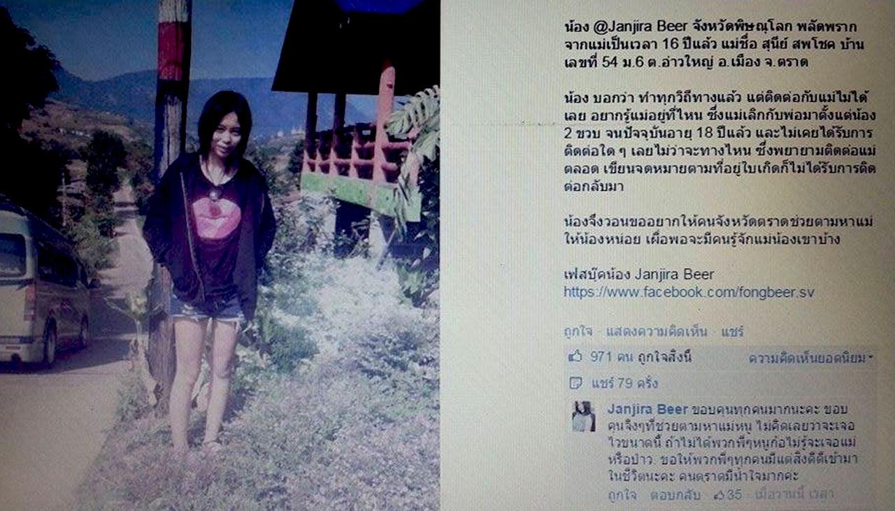 เมื่อวันที่ 14 ก.พ. 58 ผู้สื่อข่าวรายงานว่า เกิดกระแสในโลกสังคมออนไลน์ ที่ จ.ตราด อีกครั้ง เมื่อเฟซบุ๊กที่มีชื่อว่า Janjira Beer หรือ น.ส.จันทร์จิรา สู้สกุลสิงห์ อายุ 18 ปี น้องเบียร์ อยู่หมู่ 6 ต.บึงพระ อ.เมือง จ.พิษณุโลก ได้ประกาศตามหาแม่บังเกิดเกล้า ชื่อ น.ส.สุนีย์ สพโชค อยู่หมู่ 6 ต.อ่าวใหญ่ อ.เมือง จ.ตราด ที่ไม่เคยเห็นหน้านานกว่า 18 ปี ครั้งสุดท้ายที่ได้อยู่อ้อมกอดแม่ ตอนอายุประมาณ 6 เดือน
