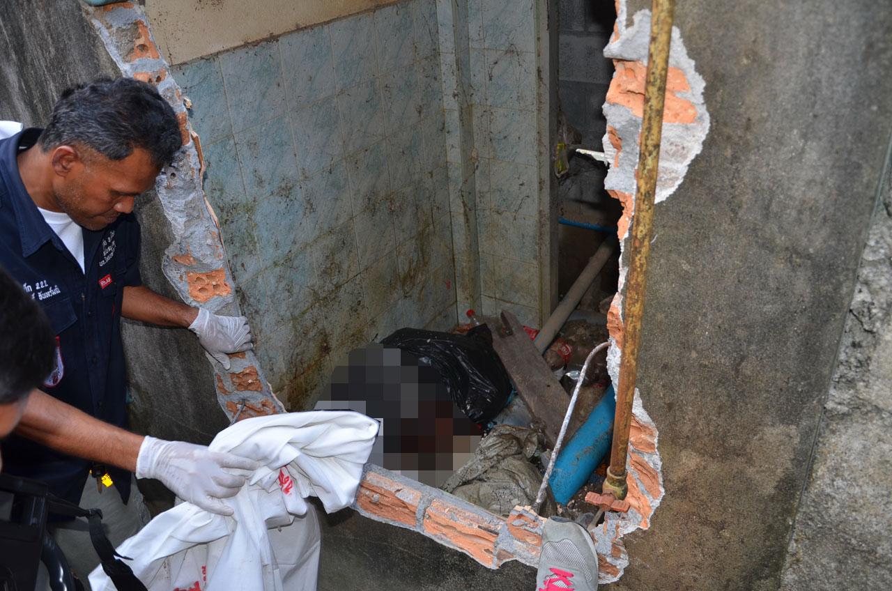เมื่อมองเข้าไปพบศพผู้ตายท่อนบนศีรษะและลำตัว ถูกคลุมด้วยถุงดำ ท่อนขาด้านล่างทั้งสองข้างอยู่ในกระสอบปุ๋ยสีขาว นอนตะแคงอยู่ในห้องน้ำร้าง ซึ่งเจ้าหน้าที่ไม่สามารถนำศพออกมาด้านนอกได้ ในที่สุดเจ้าหน้าที่ต้องขออนุญาตเจ้าของหอพัก ใช้ค้อนทุบกำแพงห้องน้ำร้าง เพื่อนำศพออกมาทางด้านหลังห้องน้ำอย่างทุลักทุเล ท่ามกลางความสนใจของบรรดานักศึกษา ม.ราชภัฏนครศรีธรรมราช ที่มามุงดูที่เกิดเหตุจำนวนมาก เนื่องจากบริเวณดังกล่าวเป็นหอพักนักศึกษาเอกชนทั้งชายและหญิงจำนวนหลายหอ