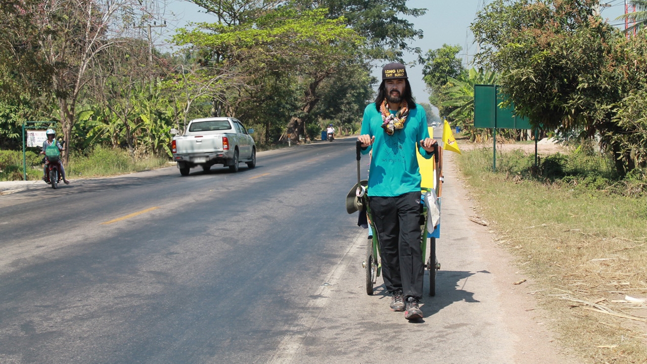 เมื่อเวลา 07.00 น. วันที่ 15 ก.พ. ที่บริเวณริมถนนท่ามะเขือ ต.ท่ามะเขือ อ.คลองขลุง จ.กำแพงเพชร พบชายมีหนุ่มแต่งกายด้วยชุดเสื้อแขนยาวสีเขียว กางเกงวอร์มขายาวสีดำ หน้าตาเต็มไปด้วยหนวดเครา มาพร้อมกับรถเข็น 2 ล้อ ด้านหน้าประดับพระบรมฉายาลักษณ์พระบาทสมเด็จพระเจ้าอยู่หัว และมีธงตราสัญลักษณ์ รวมทั้งธงชาติไทยติดที่รถเข็น โดยมีอาสาสมัครกู้ภัยมูลนิธิกำแพงเพชรสว่างธรรมสถาน ตามจุดต่างๆ ร่วมเดินรับกันเป็นทอดๆ จนกว่าจะออกจากเขต จ.กำแพงเพชร