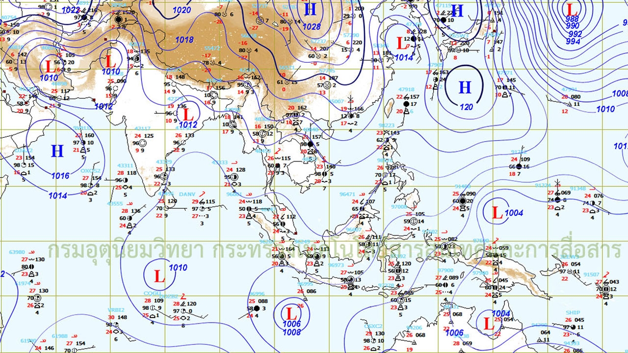 พยากรณ์อากาศสำหรับประเทศไทยตั้งแต่เวลา 06:00 วันนี้ ถึง 06:00 วันพรุ่งนี้.