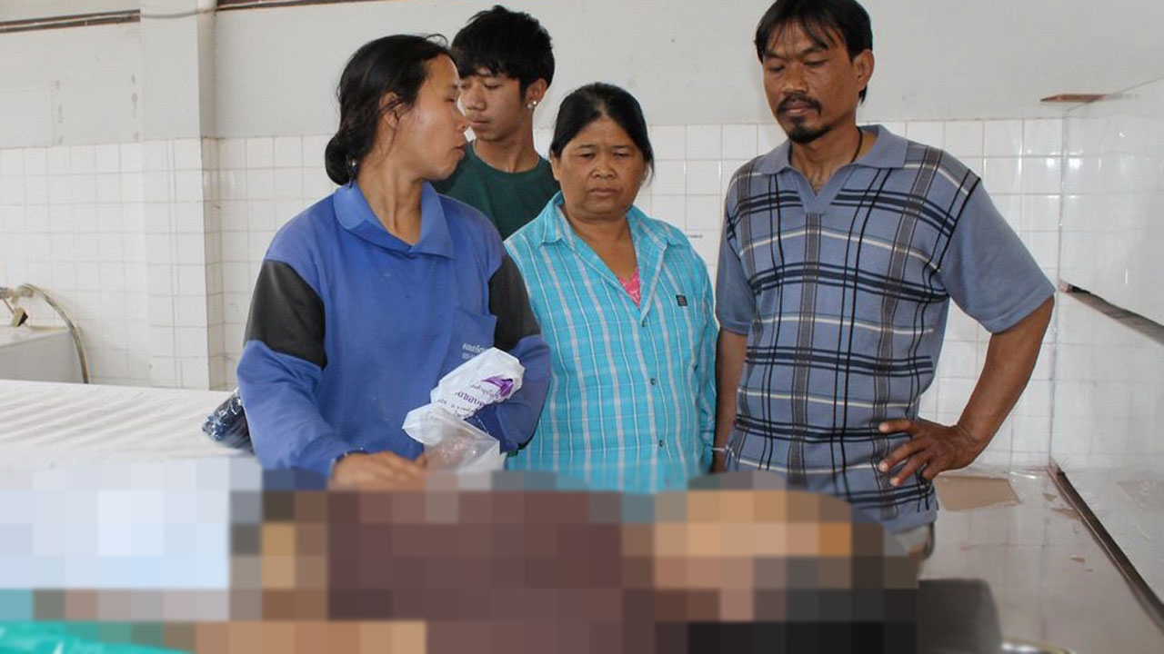สภาพศพนายสมาน ทองคำ อายุ 59 ปี ที่ป่วยเป็นอัมพฤกษ์ กินก๋วยเตี๋ยว ลูกชิ้นเอ็นเนื้อขนาดเกือบเท่าลูกปิงปองหลุดเข้าไปติดหลอดลม ถูกหามส่ง รพ.กำแพงเพชร แต่ช่วยไม่ทันแพทย์ระบุขาดอากาศ หายใจเสียชีวิตไปก่อนแล้ว.