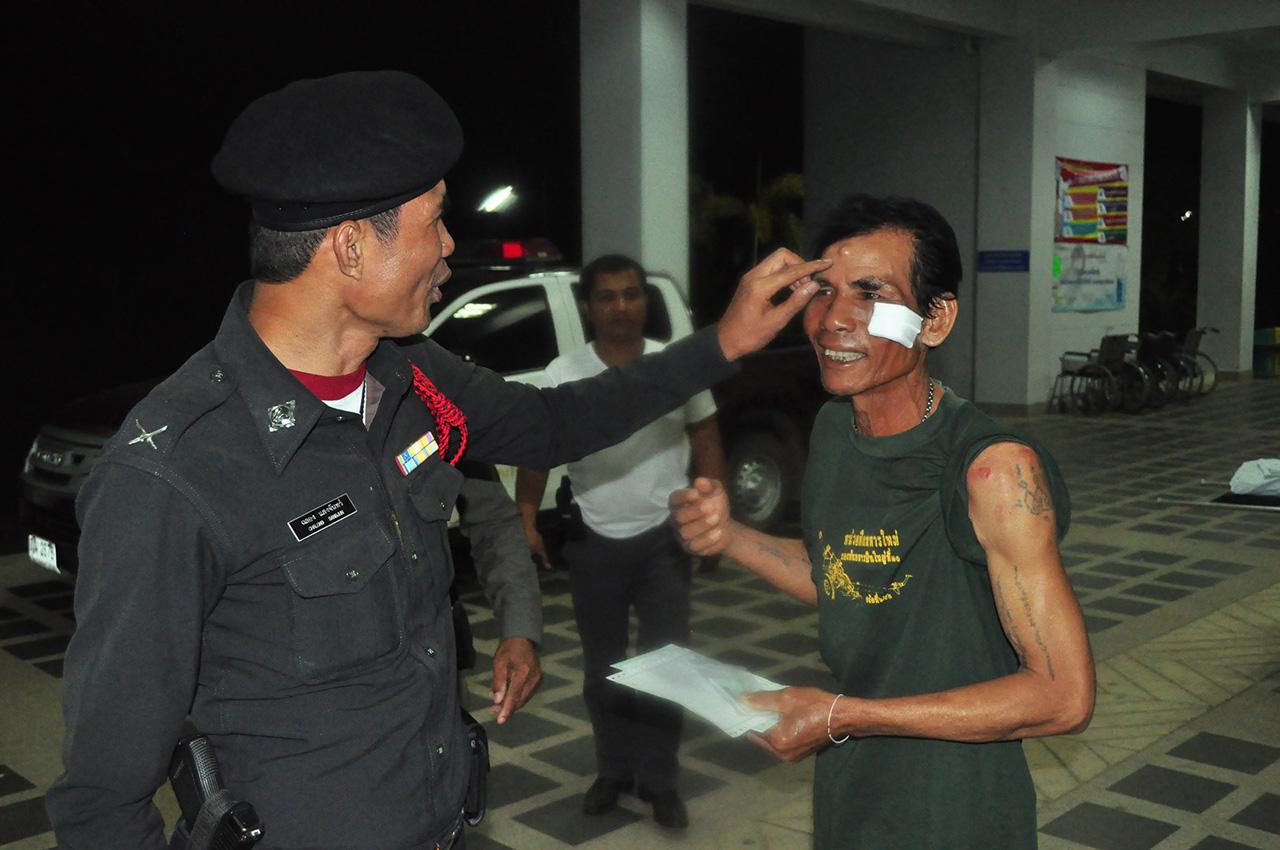 เมื่อเวลา 00.10 น.วันที่ 17 ก.ค.58 ร.ต.ท.บรรจง นาครอด พงส.สภ.บ้านในหูต อ.หลังสวน จ.ชุมพร รับแจ้งเหตุทำมีคนถูกร้ายร่างกายอาการสาหัส ที่หมู่ 7ตำบลนาขา อ.หลังสวน จ.ชุมพรจึงรุดไปที่เกิดเหตุพร้อมด้วยกำลังเจ้าหน้าที่ตำรวจจำนวนหนึ่ง ที่เกิดเหตุเป็นบ้านพักคนงานซึ่งนำสังกะสีมาต่อเติมทำเป็นบ้านในสวนยางพาราไม่มีเลขที่ หมู่ที่ 7 ตำบลนาขา อ.หลังสวน ที่บริเวณในห้องดังกล่าวพบกองเลือดขนาดใหญ่ และร่องรอยการต่อสู้จนเต้นท์นอนได้รับความเสียหาย ส่วนผู้ได้รับบาดเจ็บพลเมืองดีนำส่งโรงพยาบาลหลังสวนทราบชื่อคือนายจำลอง งาวิจิตร อายุ 60 ปี ถูกมีดพร้าฟันเข้าที่ใบหน้า 4แผล และที่ไหล่ด้านซ้าย 1 แผล ส่วนมือมีดที่ทำร้ายร่างกายนายจำลอง คือนายมาก แข็งการ อายุ 65 ปี ชาวบ้าน หมู่8 ตำบลคลองลานพัฒนา อ.คลองลาน จ.กำแพงเพชร ได้เดินทางไปแจ้งความที่ สภ.บ้านในหูตว่า ถูกนายจำลอง ทำร้ายร่างกายเช่นกันพร้อมโชว์แผลที่หัวไหล่ซ้าย และบริเวณใบหน้าให้เจ้าหน้าที่ตำรวจดูจึงได้ควบคุมตัวและนำมาสอบสวน