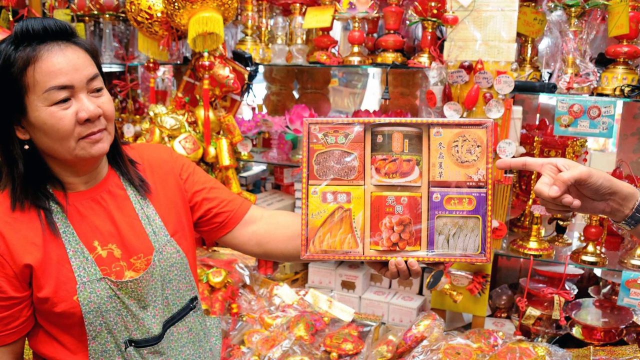 แม่ค้าในตลาดเยาวราชโชว์ชุดกระดาษนำเข้าจากจีนที่มีให้เลือกหลากรูปแบบ แต่คนสนใจเป็นพิเศษในปีนี้คือชุดสมุนไพรจีน “ถั่งเช่า” ที่จะซื้อไปเผาร่วมกับกระดาษเงินกระดาษทอง ส่งให้บรรพบุรุษนำไปใช้บำรุงร่างกาย.