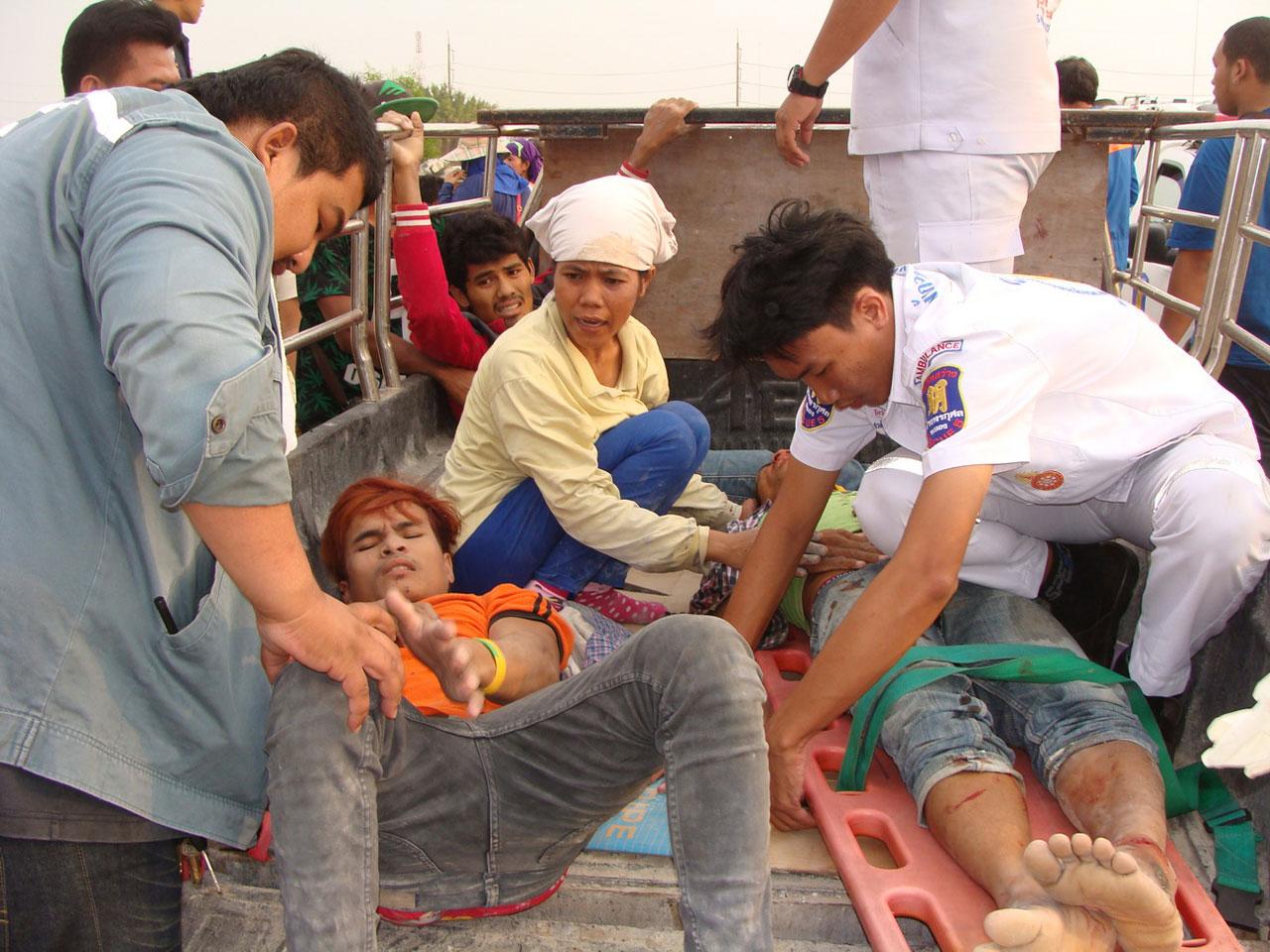 ร.ต.ท.กวีวุฒิ เผยว่า ผู้บาดเจ็บเป็นชาย 5 คน และหญิง 1 คน ทราบชื่อคือ นายเวี่ยน อายุ 27 ปี ขาหักทั้งสองข้าง นายลาย อายุ 20 ปี ขาขวาหัก นางพัน อายุ 30 ปี กำลังตั้งท้องได้ 4 เดือน บาดเจ็บขาผิดรูปทั้งสองข้าง ทั้งสามอาการสาหัส อีก 3 ราย บาดเจ็บไม่มาก มีนายรัด นายเวิ่ม และนายดา ทั้งหมดเป็นชาวกัมพูชา ทำงานแผนกช่างปูนของโครงการ และเจ้าหน้าที่กู้ภัยได้นำผู้บาดเจ็บทั้ง 6 ส่ง รพ.ระยอง เรียบร้อยแล้ว