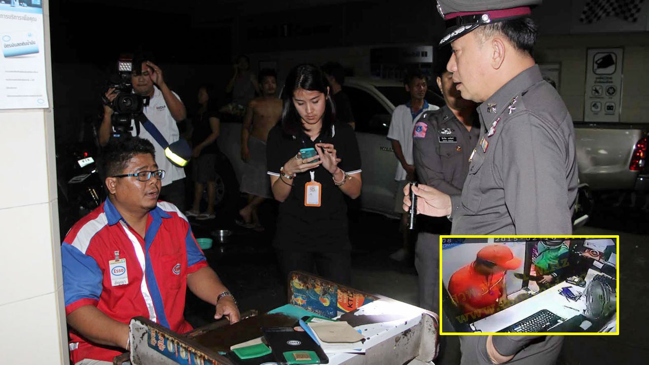 ตำรวจกำลังสอบปากคำพนักงานปั๊มน้ำมันแห่งหนึ่ง ที่ถูกคนร้าย 4 คนซ้อนรถ จยย.ออกตระเวนปล้นปั๊มน้ำมันคืนเดียว 4 แห่ง ก่อนถูกชุดจู่โจม สน.วังทองหลาง จับกุม ส่วนภาพเล็กเป็นภาพกล้องวงจรปิดขณะคนร้ายก่อเหตุ.