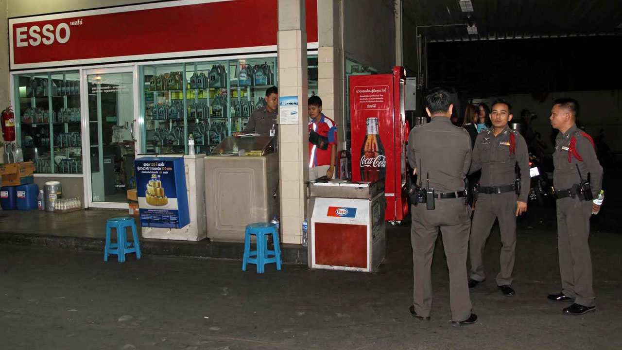 ที่เกิดเหตุพบ น.ส.นันทจิตร เมืองมาก อายุ 29 ปี พนักงานเก็บเงินปั๊มดังกล่าว ยืนรอให้การกับตำรวจด้วยอาการตื่นตระหนกในเหตุที่เพิ่งเกิด โดยให้การว่ามีคนร้ายเป็นชาย 4 คน ซ้อนท้ายรถ จยย. ฮอนด้าเวฟ 2 คัน ไม่ติดแผ่นป้ายทะเบียน โดยทำทีขับวนรอบปั๊มจอดรถ จยย.ที่ตู้เก็บเงินจากนั้นชักมีดสปาร์ตาออกมาข่มขู่ให้ส่งเงินมา พร้อมใช้มีดวิ่งไล่ฟันจนพนักงานต้องวิ่งหนี ก่อนคนร้ายเข้าไปค้นลิ้นชักได้เงินไปประมาณ 10,000 บาท หลบหนี