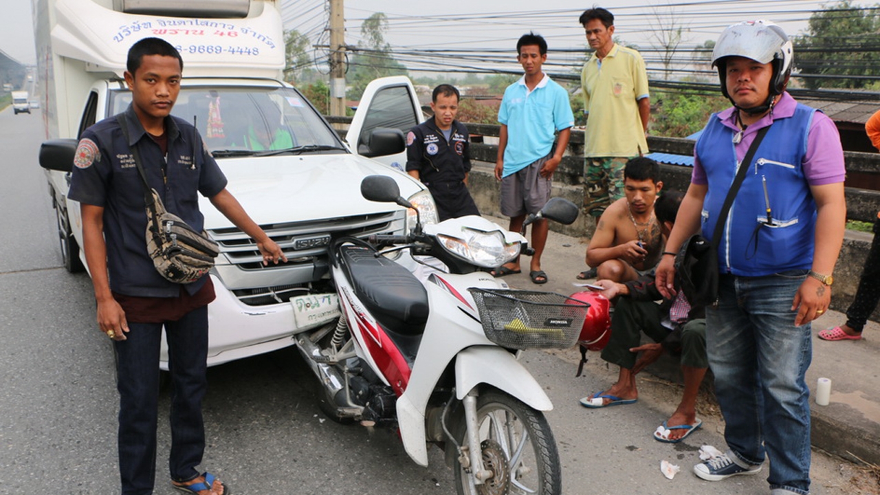 ในที่เกิดเหตุพบ พบผู้ได้รับบาดเจ็บชื่อ นายเลิศ เหล็กด่าน อายุ 57 ปี อยู่บ้านเลขที่ 50/1 ม.3 ต.หอมศีล อ.บางปะกง จ.ฉะเชิงเทรา เป็นผู้ขับขี่รถจยย. ฮอนด้า เวฟ สีขาว ทะเบียน จพว 263 ชลบุรี มีแผลถลอกตามร่างกาย ส่วนจยย.ถูกชนท้ายเสียบติดอยู่หน้ารถกระบะ อีซูซุ ดีแมคซ์ สีขาว ทะเบียน ตน 7220 กทม. ที่มีนายณัฐพล เรืองศรี อายุ 29 ปี อยู่บ้านเลขที่ 48/2 ม.1 ต.บางกระทึก อ.สามพราน จ.นครปฐม เป็นคนขับ โดยที่รถจยย.ตั้งอยู่ได้โดยไม่ล้ม
