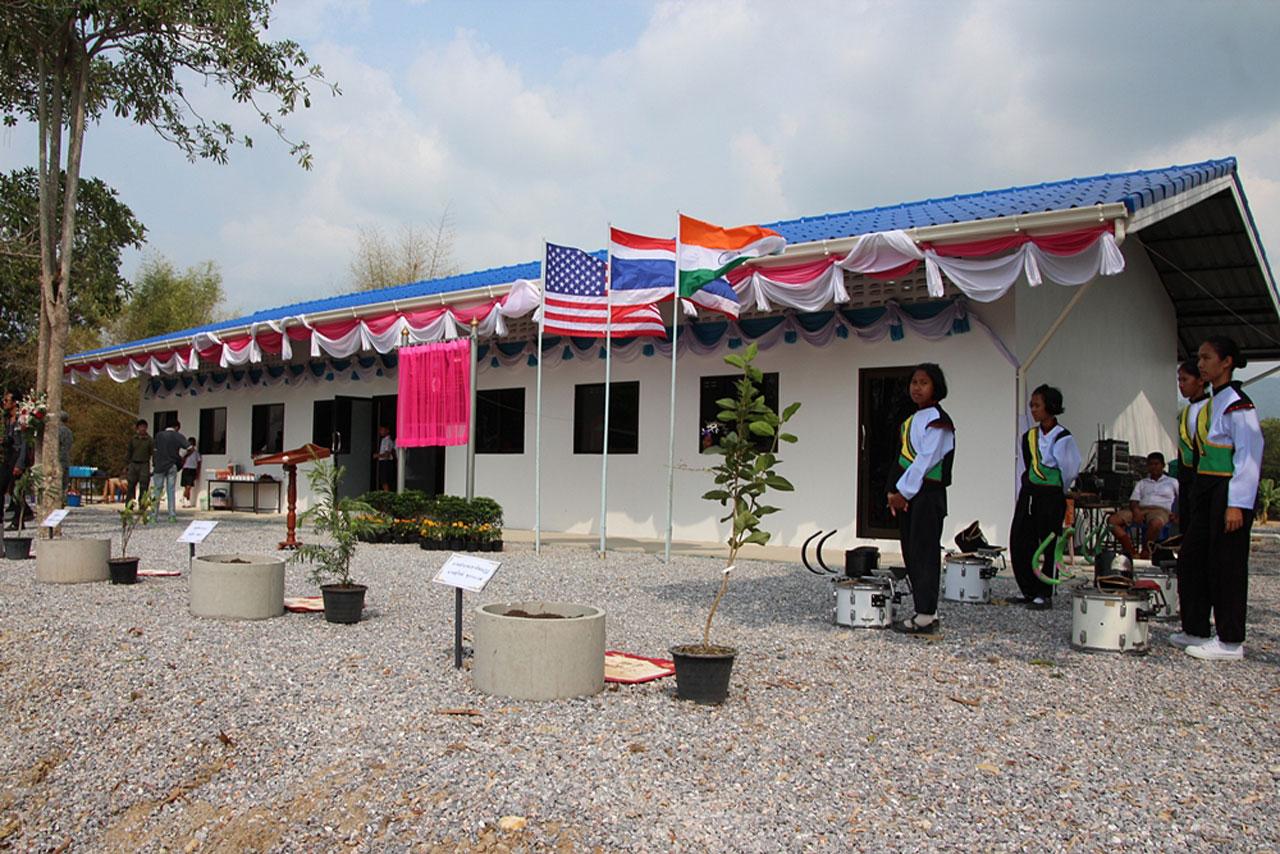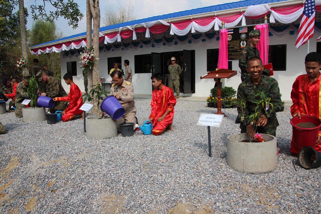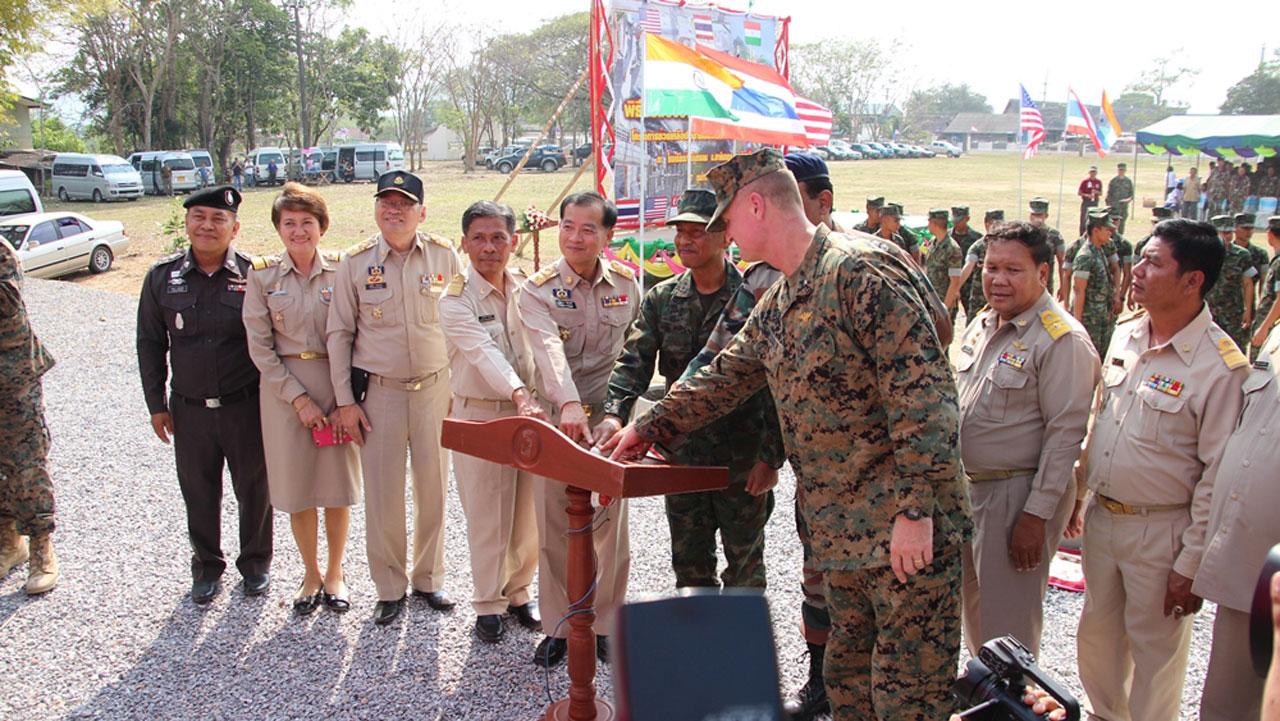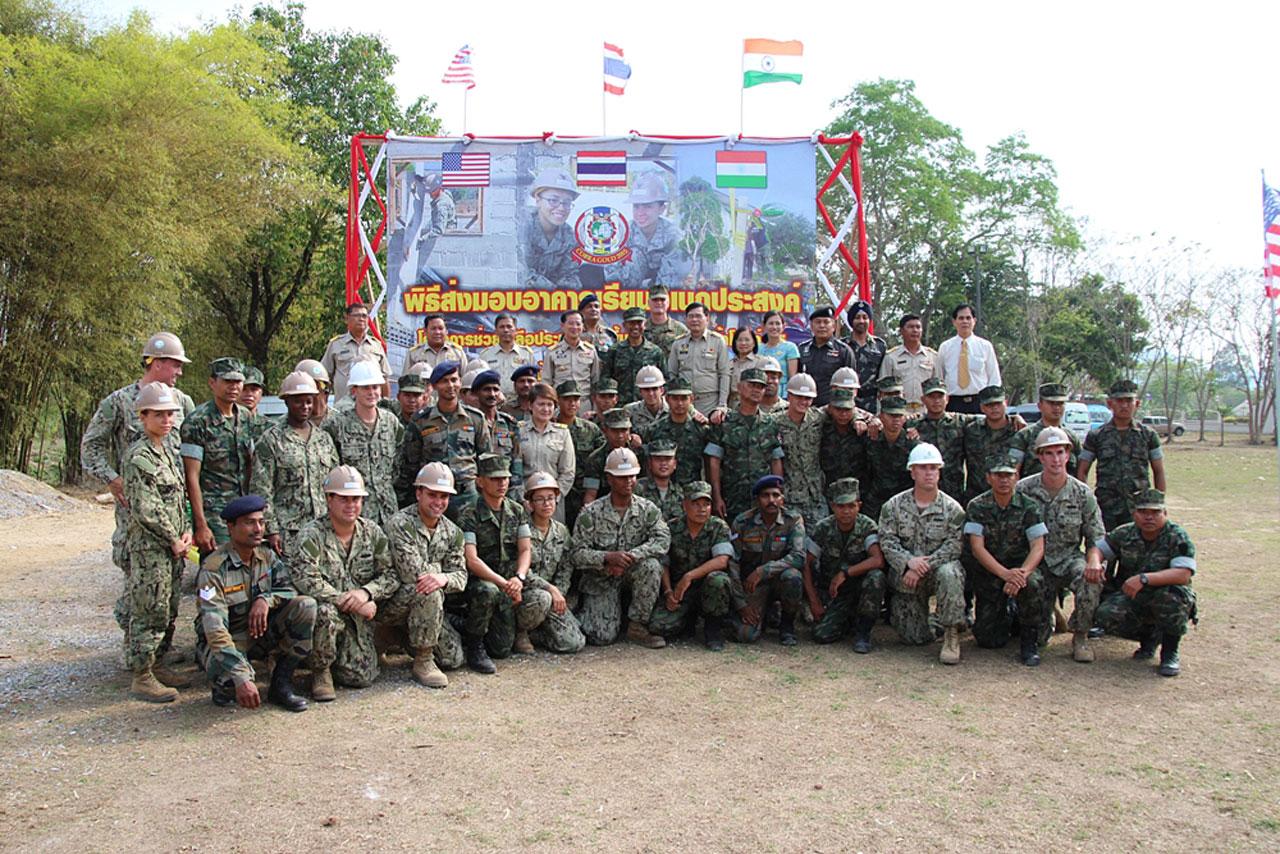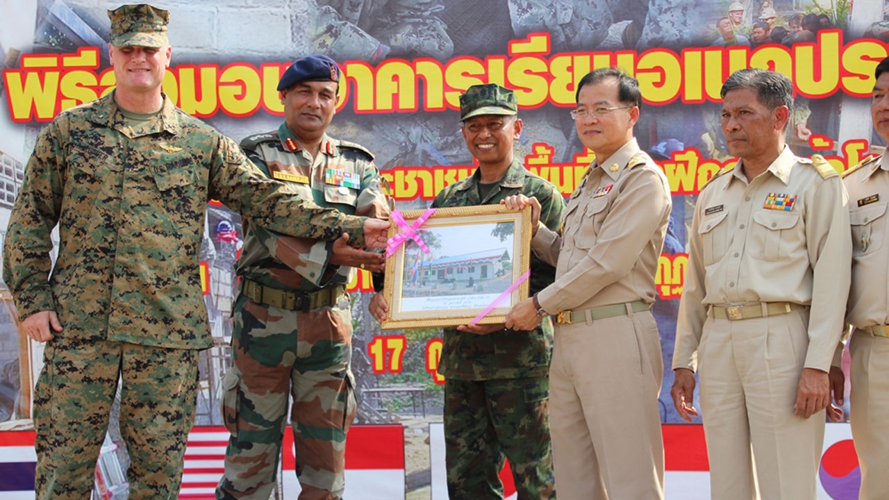 การฝึกผสม ‘คอบร้าโกลด์’ ปีนี้ มีโครงการช่วยเหลือตอบแทนชุมชน ด้วยการสร้างอาคารอเนกประสงค์ให้ประชาชนได้ใช้ประโยชน์ร่วมกัน โดย นย.ไทย กองทัพเรือสหรัฐฯ และทหารช่างอินเดีย สร้างเสร็จทำพิธีมอบแล้ว 1 หลังที่ อ.เขาคิชฌกูฏ จันทบุรี...