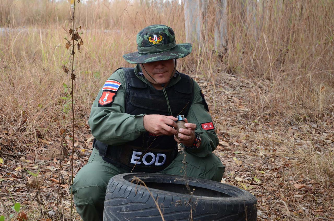จากการตรวจสอบ พบระเบิดชนิดชนิดขว้าง วางอยู่พื้นดินหน้ากระท่อมนาห่างจากถนน 5 เมตร เจ้าหน้าที่นำยางรถยนต์ไปครอบไว้ พบเป็นระเบิดเอ็ม 26 สำรอกดินระเบิดออกแล้ว เจ้าหน้าที่ใช้ผ้าเทปพันสลัก เพื่อนำไปทำลาย