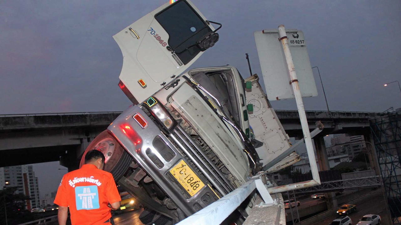 สภาพรถบรรทุกตู้คอนเทนเนอร์ 18 ล้อ พลิกตะแคงซ้ายพาดแผ่นปูนกั้นขอบทาง หวิดร่วงลงมาด้านล่าง เหตุเกิดบนด่วนขั้นที่ 1 ช่วง ทางต่างระดับบางนา มุ่งหน้าดาวคะนอง คาดโชเฟอร์ไม่ชำนาญทางและขับมาด้วยความเร็วสูง.