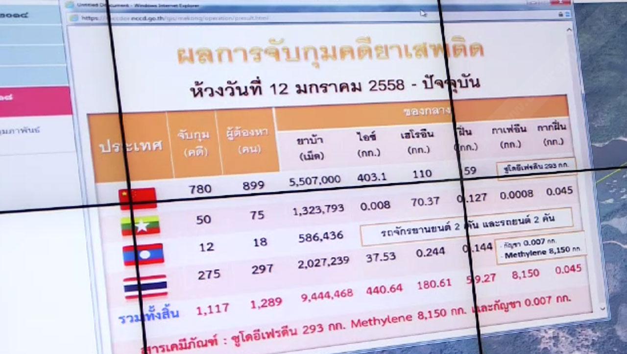 "ส่วนประเทศไทยจับกุมได้ 275 คดี ผู้ต้องหา 297 คน เป็นยาบ้า 2 ล้านบาท ยาไอซ์ 37.53 กก. เฮโรอีน 0.244 กก. ฝิ่น 0.144 กก. กัญชา 0.007 กก. เมทิลลีนคลอไรด์ 8,150 กก. /รวม 4 ประเทศจับกุม 1,117 คดี ผู้ต้องหา 1,289 ราย ยาบ้า 9.4 ล้านเม็ด ยาไอซ์ 440.64 กก. เฮโรอีน 180.61 กก. ฝิ่น 59.27 กก. กากฝิ่น 0.045 กก. ส่วนสารเคมีตั้งต้นที่ยึดได้คือ เมทิลลีนคลอไรด์ 20,000 กก. กาแฟอีน 8,150 กก." นายเพิ่มพงษ์ กล่าว