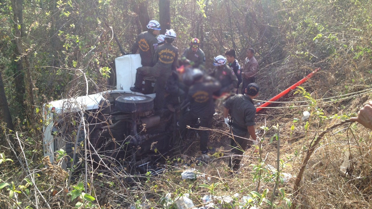 ที่เกิดเหตุ พบรถกระบะมิตซูบิชิ ไทรทัน สีขาว สี่ประตู หมายเลขทะเบียน กภ 8398 กทม. ตกลงไปไหล่ทาง ลึกประมาณ 5 เมตร สภาพพลิกตะแคง ตัวรถพังยับเยินอัดติดกับต้นไม้ใหญ่