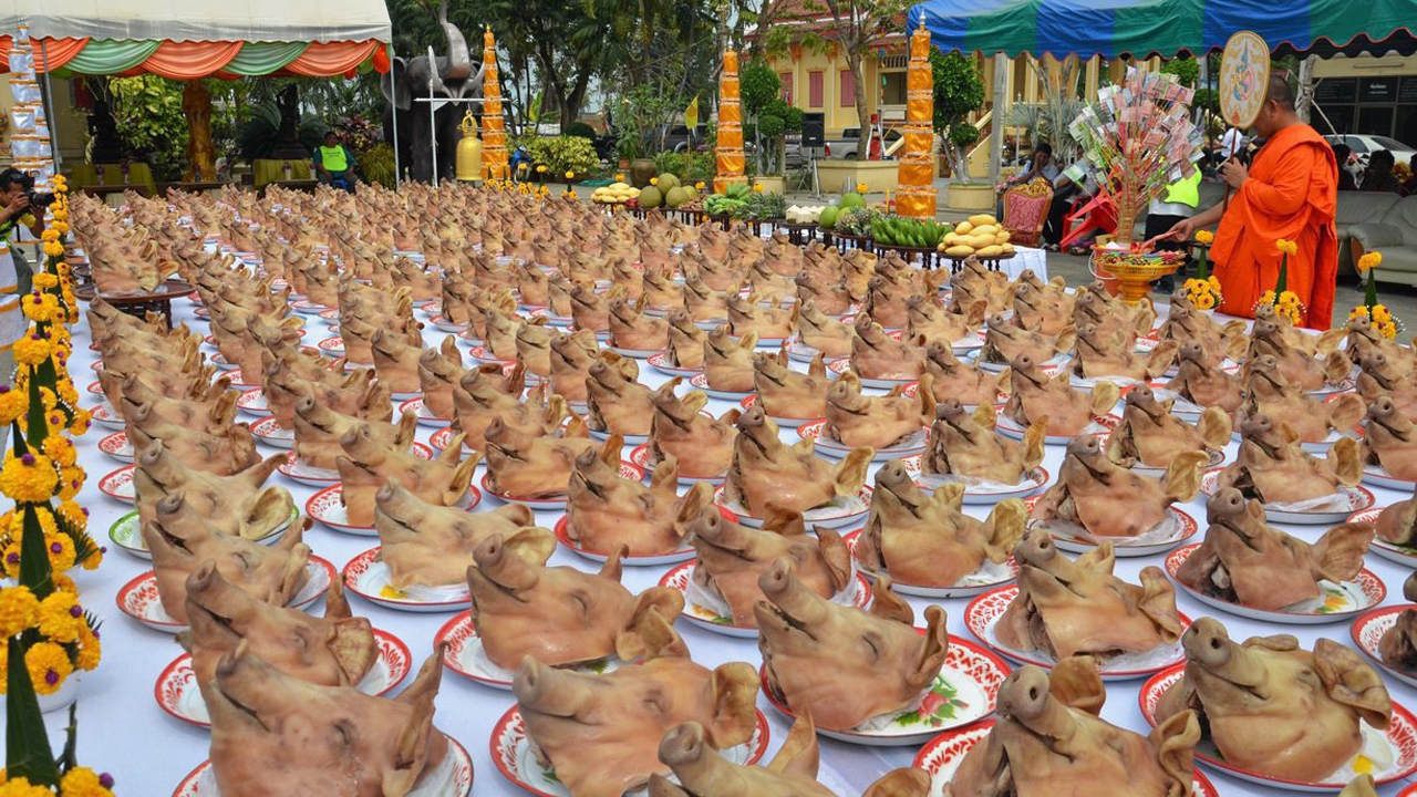 หัวหมูจำนวน 300 หัว ที่นางสมบัติ เล็กเปี่ยม แม่ค้าขายส่งผลไม้นำมาถวายแก้บนหลวงพ่อสมหวัง พระพุทธรูปปางมารวิชัยภายในวัดกลางบางพระ อ.นครชัยศรี จ.นครปฐม หลังบรรดาลูกหนี้นำเงินที่กู้ยืมกว่า 2 ล้านบาทมาใช้คืน.