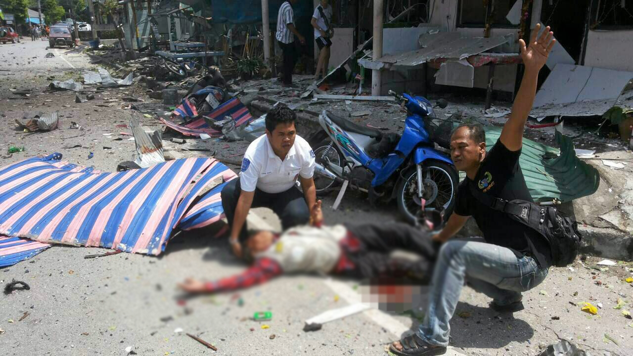 เจ้าหน้าที่ช่วยเหลือ 1 ในผู้บาดเจ็บจากเหตุคนร้ายวางระเบิดคาร์บอมบ์หนัก 25 กก. ไปซุกรถกระบะหน้าร้านคาราโอเกะ ถนน ณ นคร เขตเทศบาลเมืองนราธิวาส ร้านค้าและบ้านเรือนพังพินาศกว่า 20 หลัง ชาวบ้านผู้บริสุทธิ์เจ็บระนาวถึง 13 คน.