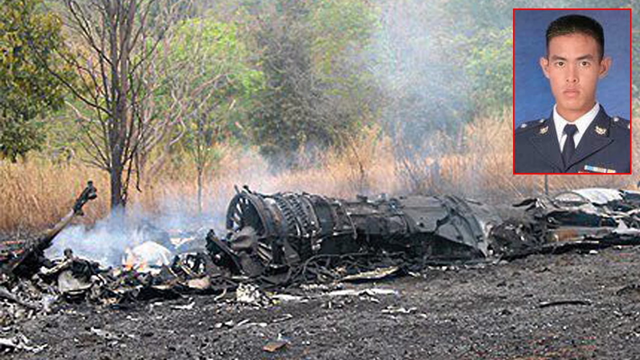 สภาพเครื่องบินเอฟ 16 กลายเป็นเศษเหล็ก หลังโหม่งโลกลงกลางทุ่ง หมู่ 4 อ.โคกสำโรง จ.ลพบุรี ขณะร่วมฝึกคอบร้าโกลด์บินซ้อมทิ้งอาวุธเป็นเหตุให้ ร.อ.นพนนท์ นิวาศานนท์ (รูปเล็ก) นักบินเสียชีวิต.