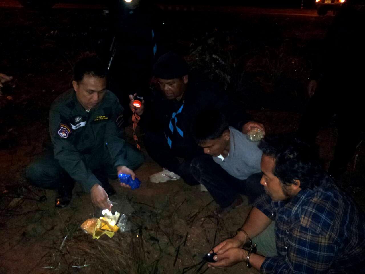 กระทั่งพบชายต้องสงสัย 2 คน ขับขี่รถจักรยานยนต์ยี่ห้อฮอนด้าเวฟ 100 สีเทาดำ ทะเบียน ขนษ 908 อุดรธานี เข้ามาจอดใกล้หลักกิโลเมตรที่ 8 บนถนนริมน้ำโขง โดยชายคนขับรถส่องไฟหน้ารถ ให้กับชายคนนั่งซ้อนท้ายลงไปหาของบางอย่าง หลังจากพบแล้ว ได้หยิบเอาสิ่งของขับรถมุ่งหน้าเข้าตัวเมืองบึงกาฬ เจ้าหน้าที่จึงได้แจ้งทุกจุดให้เตรียมพร้อมสกัดกั้น พร้อมกับขับรถไล่ติดตามประกบด้านข้างแสดงตัวให้หยุดตรวจค้น