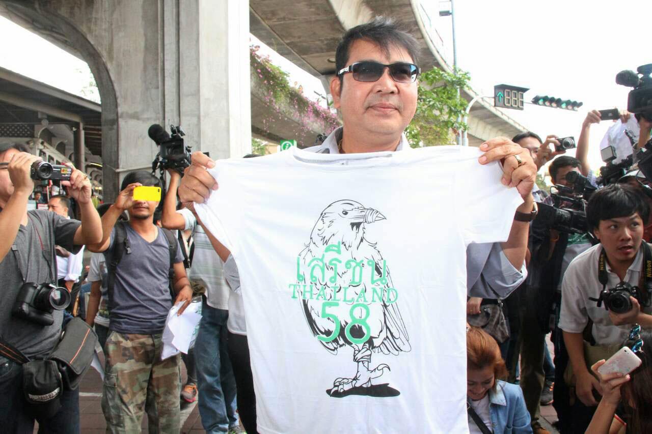 เมื่อเวลา 09.30 น. วันที่ 22 ก.พ. 58 ผู้สื่อข่าวรายงานว่าบริเวณป้ายรถเมล์หน้าห้างสรรพสินค้าเซ็นเตอร์วัน อนุสาวรีย์ชัยสมรภูมิ นายอัครกฤษณ์ นุ่นจันทร์ ประธานกลุ่มเสรีชนไทยแลนด์ 58 พร้อมพวกรวม 2 คน ได้มีการนำเสื้อกลุ่มเสรีชนไทยแลนด์ 58 ที่มีรูปนกถูกมัดปากและขา พร้อมด้วยใบปลิวเเถลงการณ์ของกลุ่มเเจกให้กับประชาชนในบริเวณนั้น ซึ่งมีเนื้อหาว่า ไม่ได้มาชุมนุมประท้วง หรือกระทำการท้าท้ายกฎอัยการศึก เพียงเเต่เพื่อต้องการแสดงความคิดเห็นให้รัฐบาลเปิดเวทีกลางเพื่อระดมความคิดเห็นจากประชาชนทั่วไป เพื่อแก้ไขปัญหาราคาสินค้าเเพง ลดค่าครองชีพ และปัญหาในด้านต่างๆ