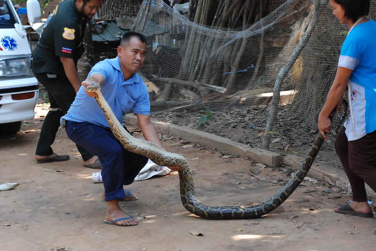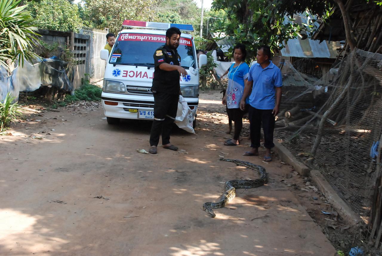 เมื่อเวลา 15.00 น. วันที่ 23 ก.พ. 58 นายภาณุวัฒน์ ศรีสุข ผู้ใหญ่บ้าน ม.6 บ้านจอมกิตติ ต.เวียง อ.เชียงแสน จ.เชียงราย รับแจ้งจาก นายบุญสิงห์ แก้วรากมุข อายุ 44 ปี บ้านเลขที่ 144 ม.6 เป็นผู้ช่วยผู้ใหญ่บ้าน บ้านจอมกิตติ ว่า มีงูเหลือมขนาดใหญ่ขดอยู่ข้างห้องน้ำในบ้าน จึงแจ้งให้หน่วยกู้ภัยอานุภาวธรรม เข้าช่วยเหลือ ที่เกิดเหตุเป็นบ้านชั้นเดียวอยู่ในซอย 5 พบงูเหลือมยาวประมาณ 3 เมตรครึ่ง นอนขดอยู่หน้าห้องน้ำในบ้าน หน่วยกู้ภัยอานุภาวธรรมได้ใช้ ถุงฟางล่อให้งูเลื้อยเข้าไป แต่งูพยายามจะเลื้อยหนี เมื่อเจ้าหน้าที่เข้าใกล้เจ้างูเหลือมก็ตั้งท่าจะฉกใส่เจ้าหน้าที่ สุดท้ายก็สามารถจับงูใส่ถุงได้