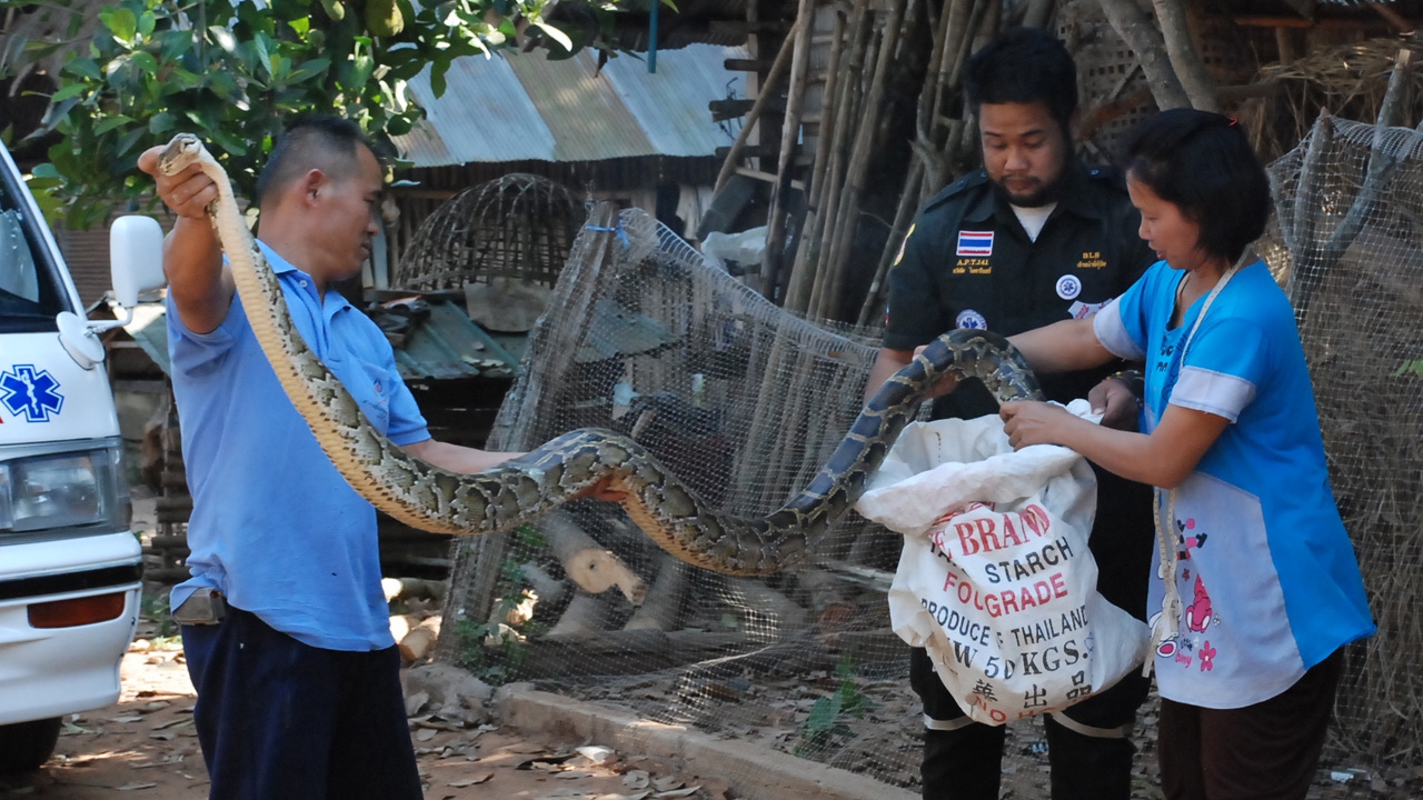 ภรรยาร้องช่วยหลังพบงูเหลือมตัวใหญ่ ยาวกว่า 3 เมตร บุกเข้าบ้านผู้ช่วยผู้ใหญ่บ้าน อ.เชียงแสน จ.เชียงราย หลังเขมือบไก่ไปหลายตัว จนท.ใช้เวลาพักใหญ่จับปล่อยคืนสู่ธรรมชาติ