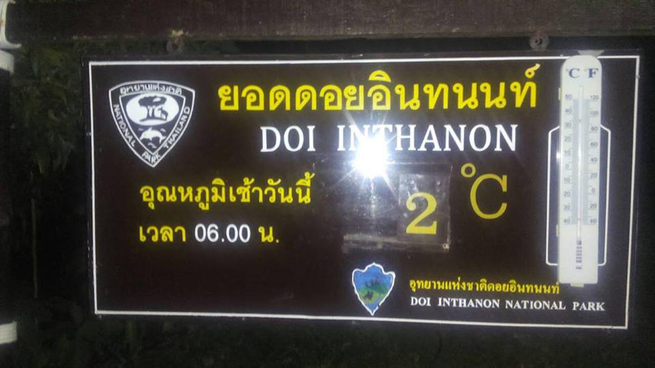 เมื่อเวลา 07.00 น. วันที่ 24 ก.พ. 58 นายพรเทพ เจริญสืบสกุล หัวหน้าอุทยานแห่งชาติดอยอินทนนท์ อ.จอมทอง จ.เชียงใหม่ เปิดเผยว่า อุณหภูมิยอดดอยเช้านี้ วัดได้ 2 องศาฯ มีน้ำค้างแข็งบางๆ บริเวณจุดชมวิวกิ่วแม่ปานเช้านี้ อุณหภูมิ วัดได้ต่ำสุด 3 องศาฯ อากาศเปิด นักท่องเที่ยวพากันลงมาบันทึกภาพน้ำค้างแข็ง ซึ่งมีให้เห็นบางจุด บริเวณทางขึ้นสู่ยอดดอย