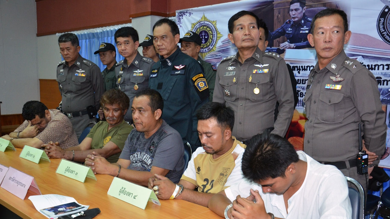 เมื่อเวลา 11.00 น. วันที่ 25 ก.พ.ที่ห้องประชุมชั้น 3 ตำรวจภูธร จ.ภูเก็ต พล.ต.ต.พชร บุญญสิทธิ์ ผบก.ภ.จว.ภูเก็ต พ.ต.อ.พีระยุทธ การะเจดีย์ พ.ต.อ.ธีระพล ทิพย์เจริญ พ.ต.อ.สมาน ชัยณรงค์ รอง.ผบก.ภ.จว.ภูเก็ต พ.ต.อ.สมคิด บุญรัตน์ ผกก.สส.ภ.จว.ภูเก็ต แถลงข่าวการจับกุมแก๊งมือปืน-ผู้ใช้จ้างวานฆ่าผู้อื่น ประกอบด้วย นายอดิศักดิ์ พลีการ อายุ 40 ปี นายเกรียงไกร ยิ้มแก้ว อายุ 51 ปี นายอิมราน หลานนุ้ย อายุ 42 ปี นายวรวุฒิ ผิวดำ นายฮาหลีม รักมิตร อายุ 48 ปี ตามหมายจับของศาล จ.ภูเก็ต ในข้อหา ร่วมกันฆ่าผู้อื่นและพยายามฆ่าผู้อื่นโดยไตร่ตรองไว้ก่อน ร่วมกันมีอาวุธปืนและเครื่องกระสุนปืนไว้ในครอบครองโดยไม่ได้รับอนุญาต ร่วมกันพกพาอาวุธปืนและเป็นผู้ก่อให้ผู้อื่นกระทำความผิด พร้อมของกลางอาวุธปืนขนาด 9 มม.จำนวน 1 กระบอก อาวุธปืนไทยประดิษฐ์ (หักคอไอ้แท่ง) จำนวน 1 กระบอก และโทรศัพท์มือถืออีกจำนวนหนึ่ง