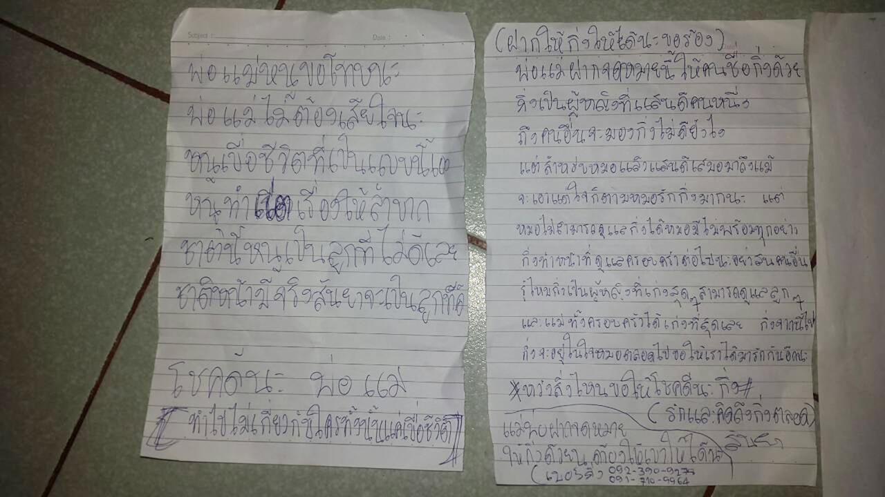 ส่วนอีกฉบับผู้ตายได้เขียนตัดพ้อถึงแฟนสาว โดยมีใจความว่า "ฝากให้กิ่งให้ได้นะขอร้อง พ่อ-แม่ฝากจดหมายนี้ให้คนชื่อกิ่งด้วย กิ่งเป็นผู้หญิงที่แสนดีคนหนึ่ง ถึงคนอื่นจะมองกิ่งไม่ดีอย่างไร แต่สำหรับหมอแล้วแสนดีเสมอมาถึงแม้จะเอาแต่ใจก็ตาม หมอรักกิ่งมากนะแต่หมอไม่สามารถดูแลกิ่งได้ หมอมีไม่พร้อมทุกอย่างกิ่งทำหน้าที่ดูแลครอบครัวต่อไปนะอย่าสนคนอื่น กิ่งเป็นผู้หญิงที่เก่งสุดๆ สามารถดูแลลูกๆ และแม่ทั้งครอบครัวได้เก่งที่สุดเลย กิ่งจากนี้ไป กิ่งจะอยู่ในใจหมอตลอดไป ขอให้เราได้มารักกันอีกนะ หวังสิ่งไหนขอให้โชคดีนะกิ่ง รักและคิดถึงกิ่งตลอดสัญญา แม่-พ่อฝากจดหมายให้กิ่งด้วยนะต้องให้เขาให้ได้นะ"