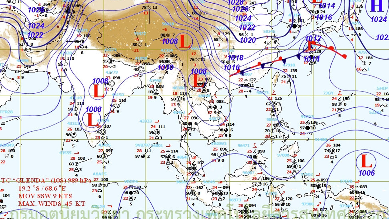 ภาคใต้ (ฝั่งตะวันตก) มีเมฆบางส่วน อุณหภูมิต่ำสุด 21-23 องศาเซลเซียส อุณหภูมิสูงสุด 32-36 องศาเซลเซียส ลมตะวันออก ความเร็ว 15-30 กม./ชม. ทะเลมีคลื่นสูงประมาณ 1 เมตร