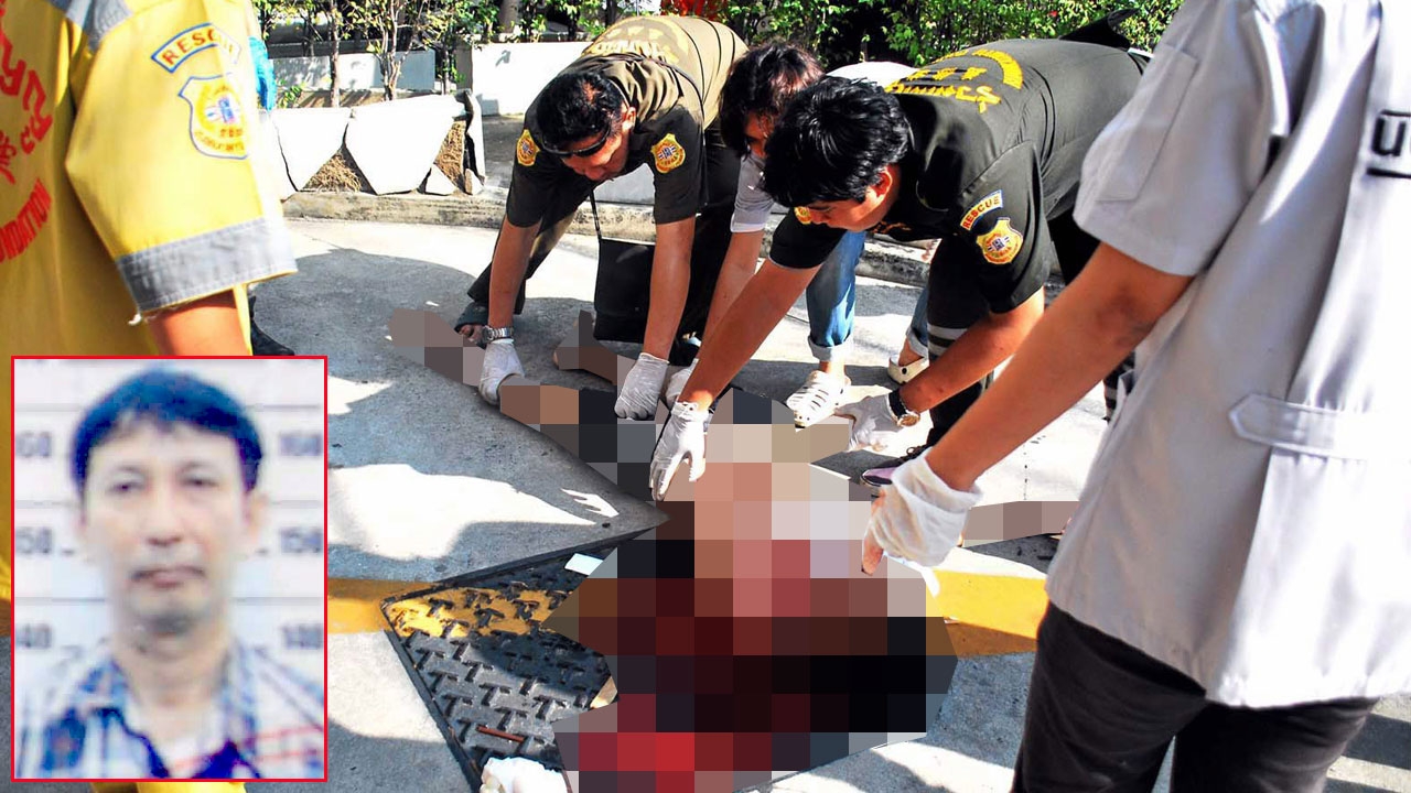 สภาพศพนายสมชาย องค์ศิริ (รูปเล็ก) ผู้จัดการฝ่ายส่งออกของธนาคารเอ็กซิม แบงก์ และเป็นอาจารย์พิเศษที่มหาวิทยาลัยธนบุรี ศูนย์การศึกษาศรีวัฒนา (บางนา) ที่กระโดดจากชั้น 8 อาคารเดอะลิงค์ คอนโดมิเนียม ซอยสุขุมวิท 50 ภรรยาเผยสาเหตุจากเครียดเรื่องสุขภาพและเรื่องงาน.