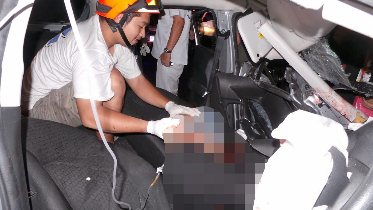 ที่เกิดเหตุเป็นถนน 3 ช่องทาง ช่องซ้ายสุดพบรถตู้โดยสารโตโยต้า คอมมูเตอร์ สีขาว ทะเบียน 15- 0304 กรุงเทพมหานคร เลขข้างรถ ม.2 จ9915-71 ต. วิ่งระหว่างกรุงเทพฯ-จอมบึง สภาพด้านท้ายรถพังยับ ห่างไป 5 เมตร พบรถยนต์มิตซูบิชิ มิราจ สีบรอนซ์ ทะเบียน ขฉ 7091 ชลบุรี สภาพรถด้านหน้าโดยเฉพาะฝั่งซ้ายพังยับ จนถุงลมนิรภัยทำงานทั้ง 2 ใบ เลือดกระเซ็นเต็มไปหมด ในรถมีผู้ติดอยู่ภายใน 3 คนร้องโอดครวญด้วยความเจ็บปวด